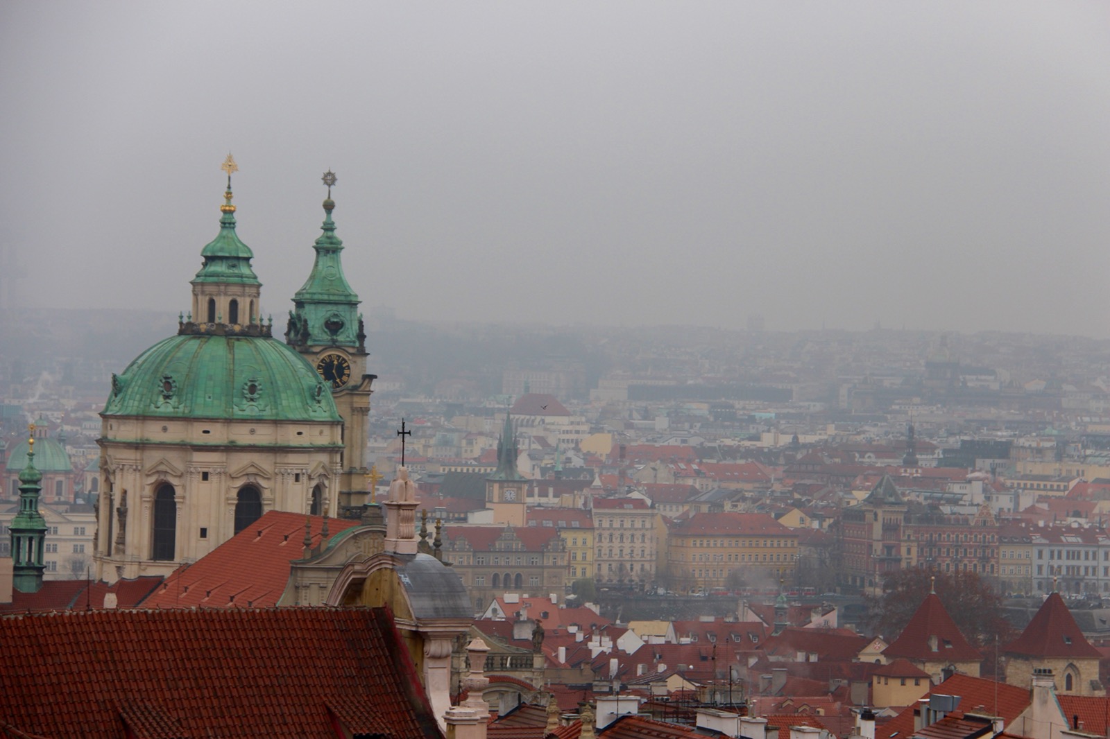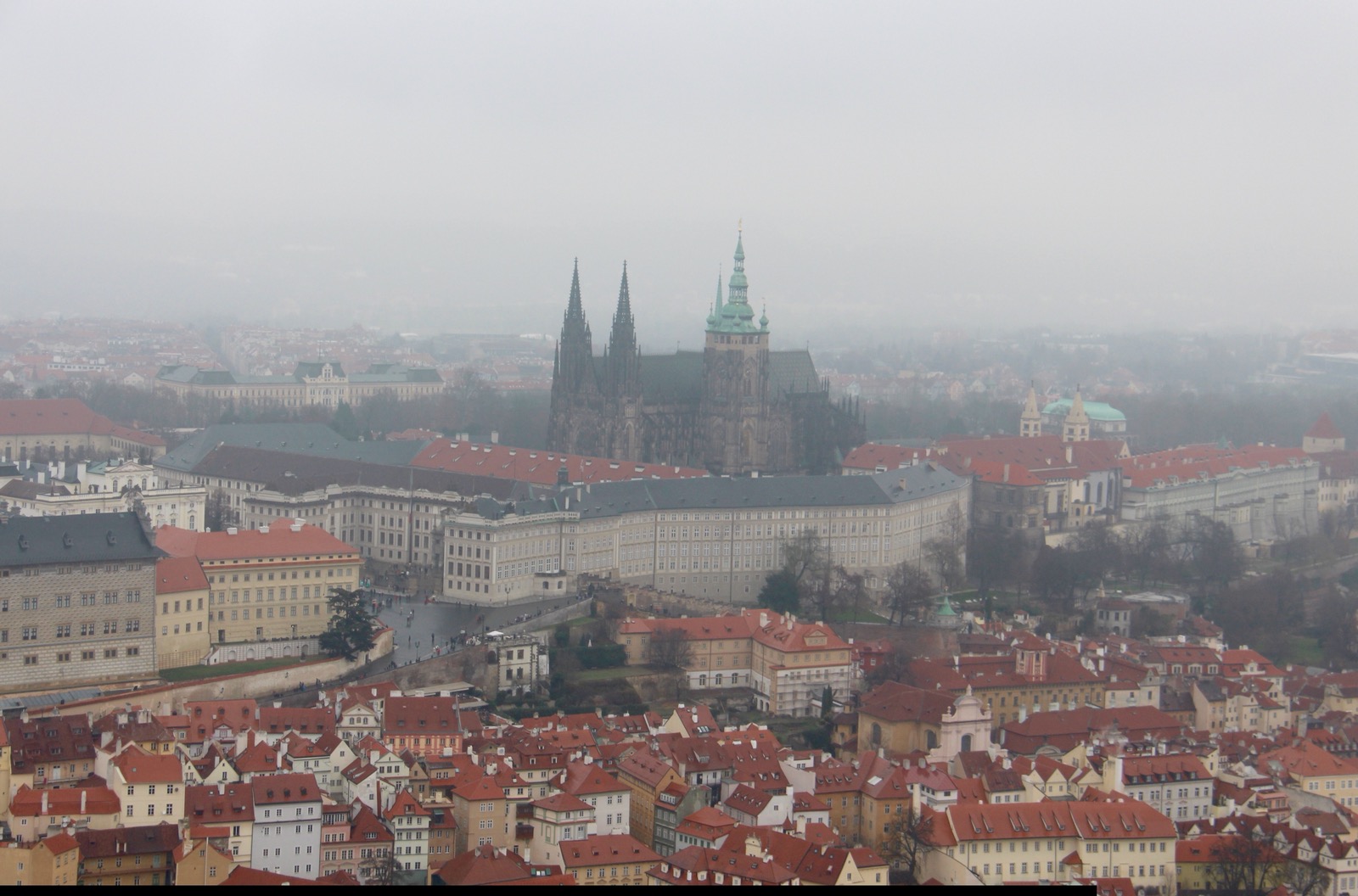 The view wasn’t that great from the tram – rather obstructed by the trees. At the top is a large park (but a bit bleak in the winter, with not much to look at!) and the Petrin lookout tower. Which of course, I had to go up! As you climbed, it became windier – and could feel the tower being blown side to side! It was all open and felt quite exposed! The top level was completely disappointing – made of glass panels and all fogged up! So I headed back down the stairs to where it was open and you could actually see out! Unfortunately today the views were not that great. It was raining (all day!) and foggy. You could still see across the city, with the bridges weaving across the river, but not quite the amazing city view that it could have been.
