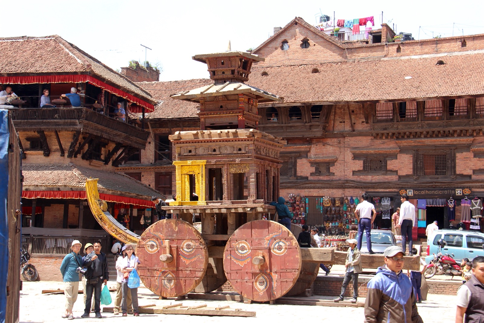 Steep stone steps lead up the sides, flanked by large concrete statues of dragons and elephants. The views from the top across the square were lovely and you could see all the surrounding mountains. In the middle of the square they were getting ready for Nepali new year, a wagon was out and children were playing on it!