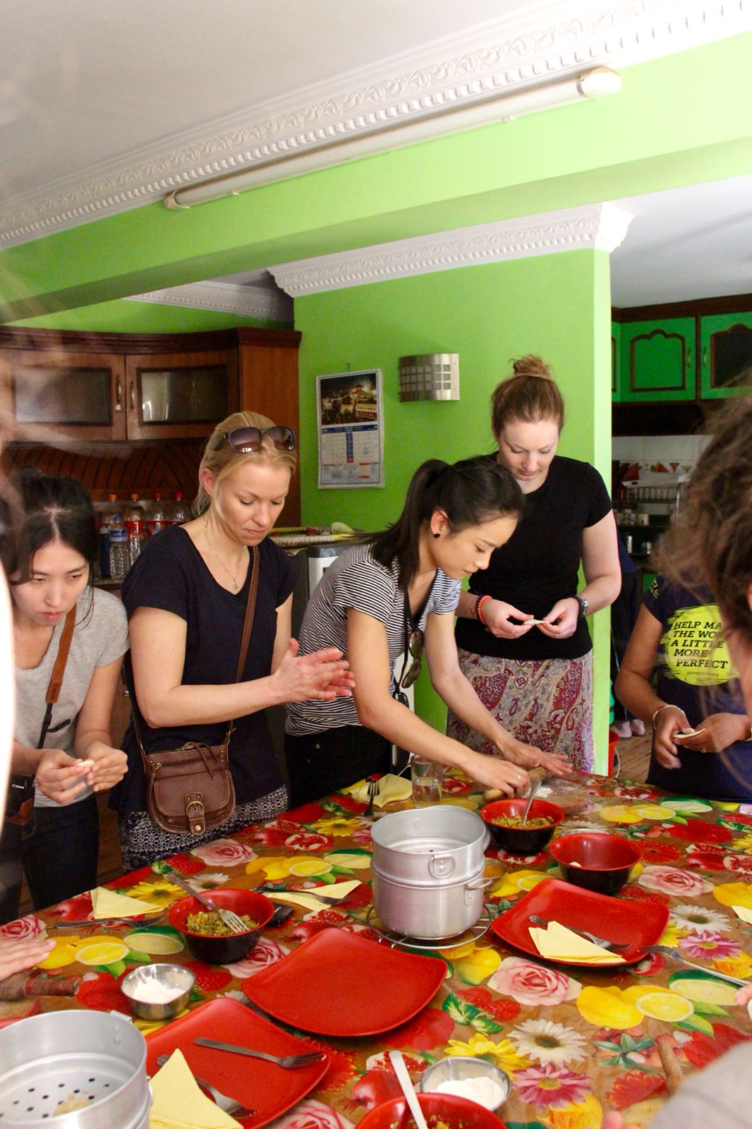 We called into an organisation called SOC. This was set up for women survivors of human trafficking and teaches them new skills. They run a cafe here also. We got to try making momos. The dough is made from flour and water – you roll it out into a circle and add a spoon of filling, which is vegetables cut up really small, then pinch the edges around to seal it in a moon or sun shape. That was fun!