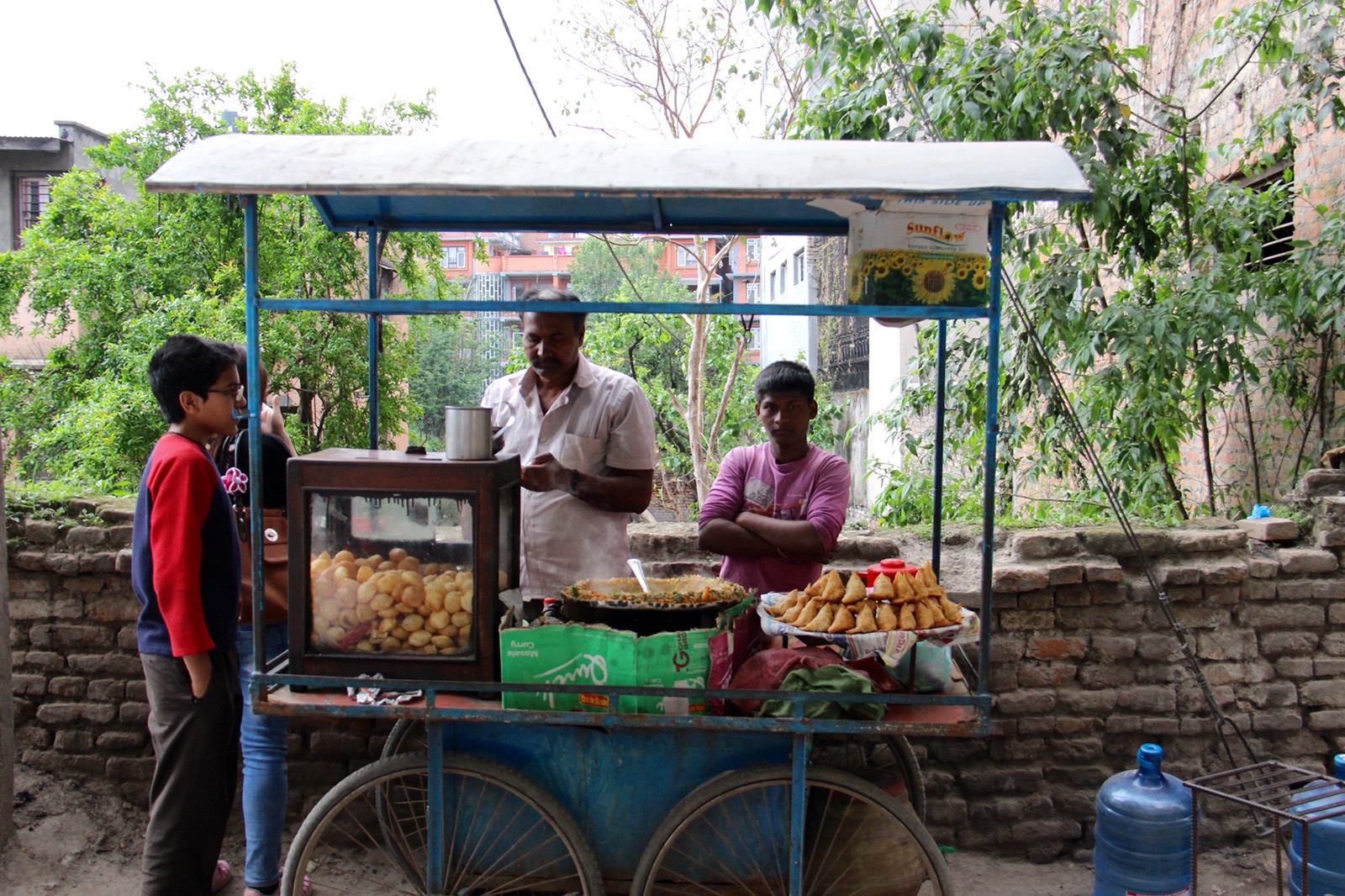 We left via a different entrance and headed up through a residential area. It was still busy, motorbikes speeding down the narrow alleyways, dodging dogs, goats, chickens and children playing in the street. We passed several fast food momo stalls – busy as people had some dinner! And after an hour of walking, we made it back to the hotel!! Now 6.30pm – been walking all day!! After a short break, we headed out to dinner at 7.30pm.