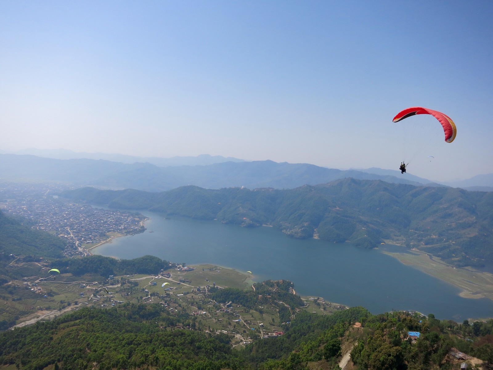 I’ve paraglided before (in Bolivia back in 2010), but I was still a bit nervous! When you get lifted higher into the air your stomach just drops. We circled around and around, we could see for miles it was such a clear day. Snowy mountains in the distance, pokhara lake below us and small villages and farms across the side of the mountain. It was really cool. We stayed up for half an hour, circling around and around in the sky.