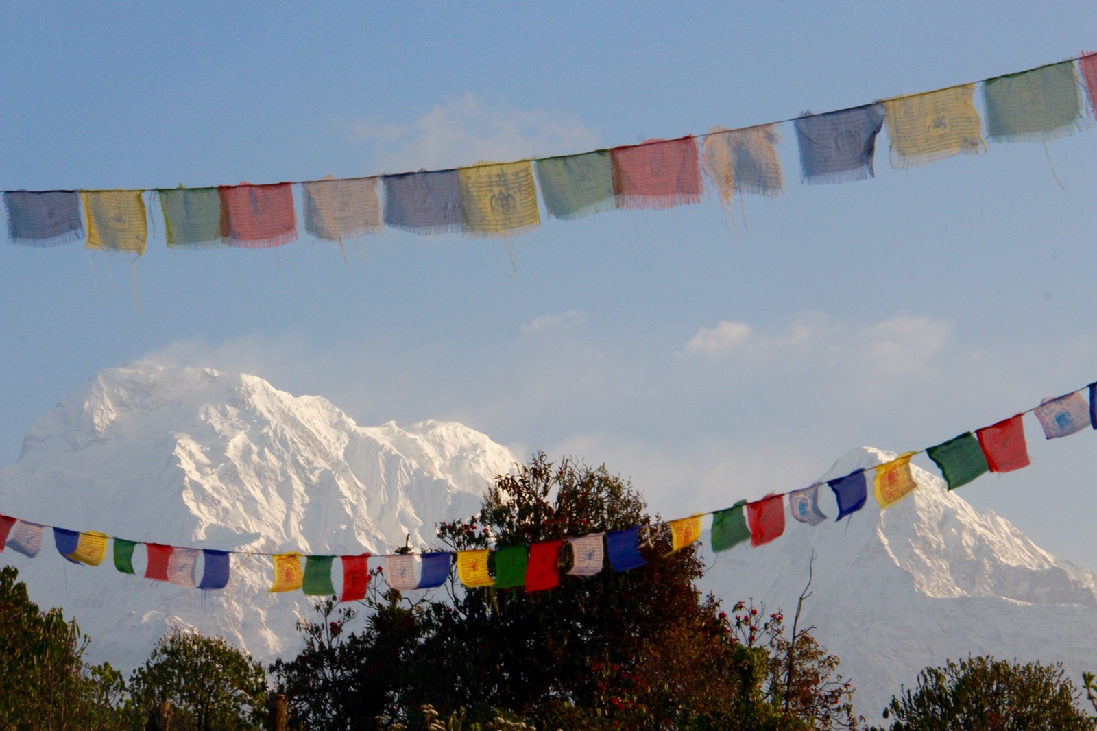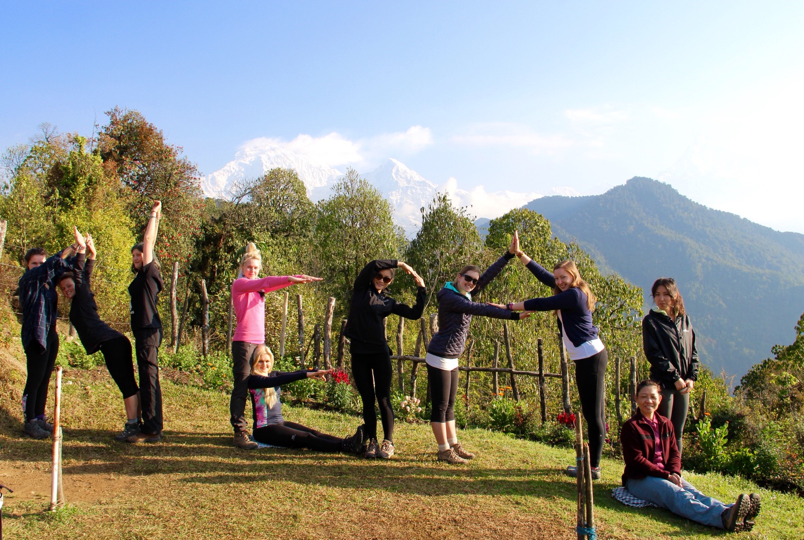 We had breakfast at 6.30am and predictably I had a banana pancake. After a few stupid photos on the edge of the garden with the amazing view, spelling out Nepal with people and having some last group photos with out porters, we set off at 7.30am.