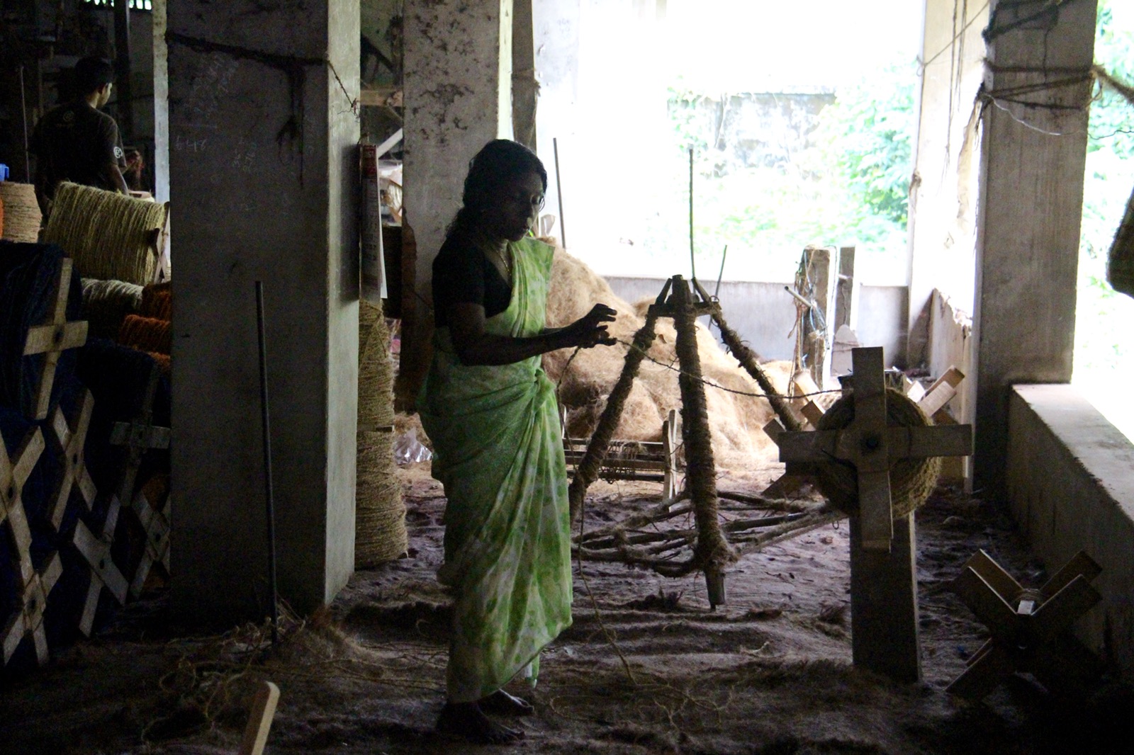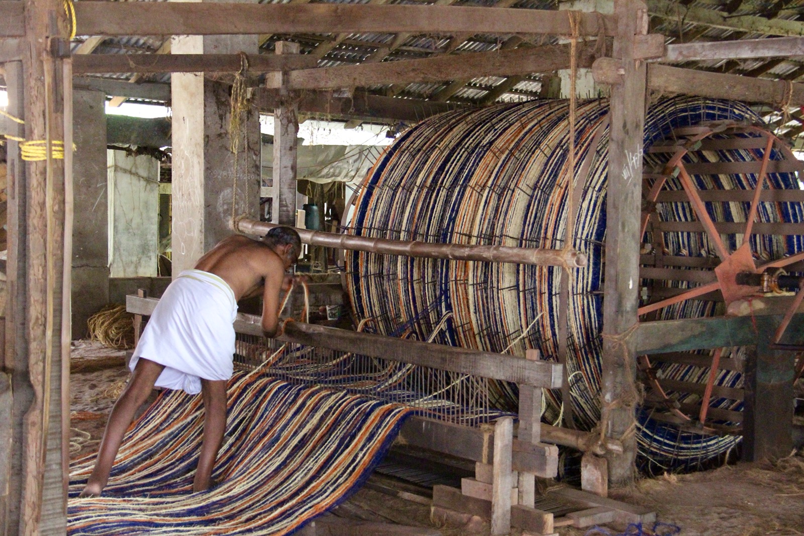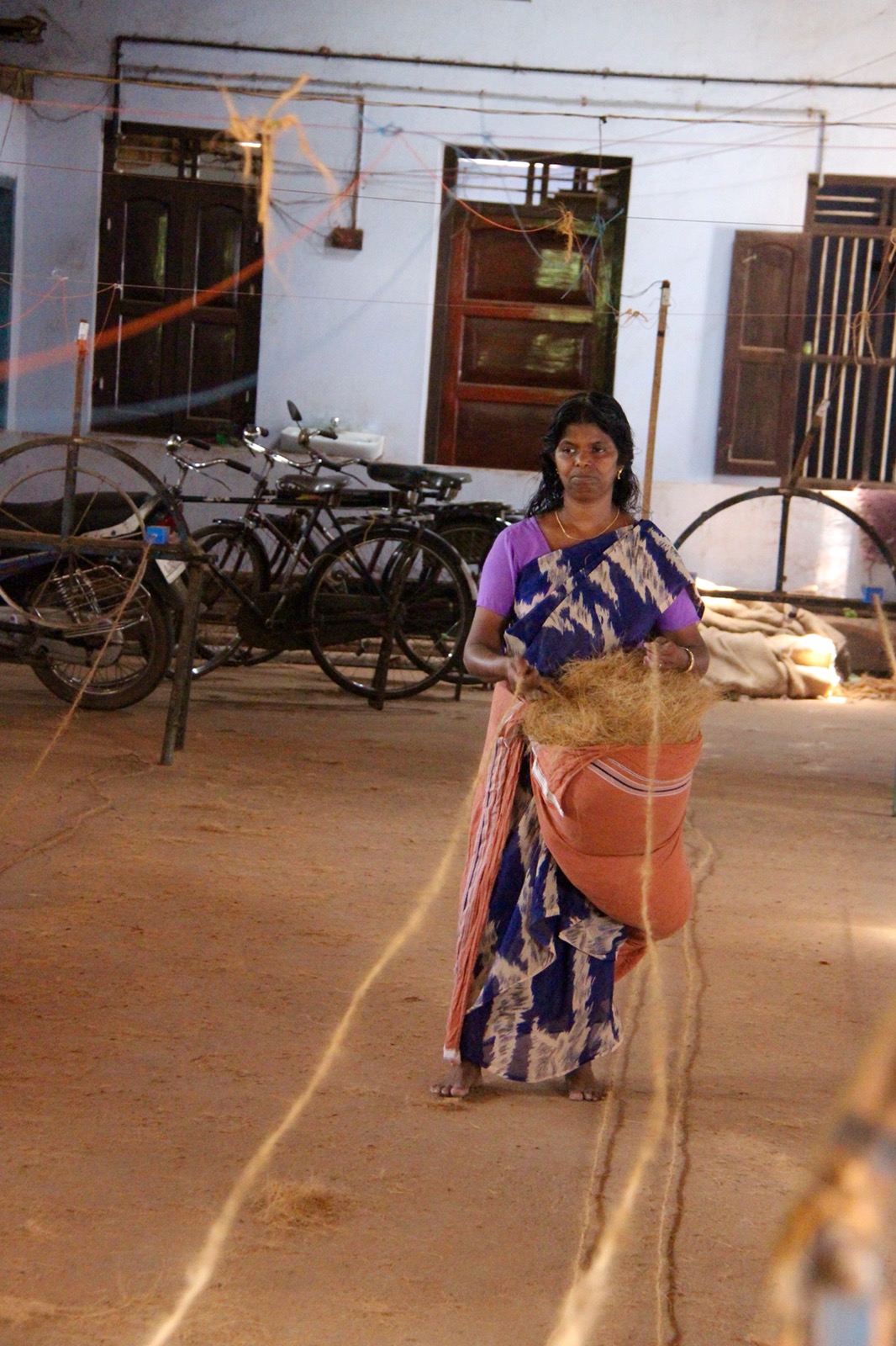 Then back onto the bus for the drive to Allepey. We drove mostly along a dual carriageway – there isn’t much rules to the road, instead everyone just drives anywhere. Everywhere is so green and full of Palm trees. We stopped off enroute at a coconut fibre rope making place. Coconuts have a shiny outer coating, once you remove that, underneath is lots of fibre. These are dried, then pulled off, layed out and then hand pulled into ropes.