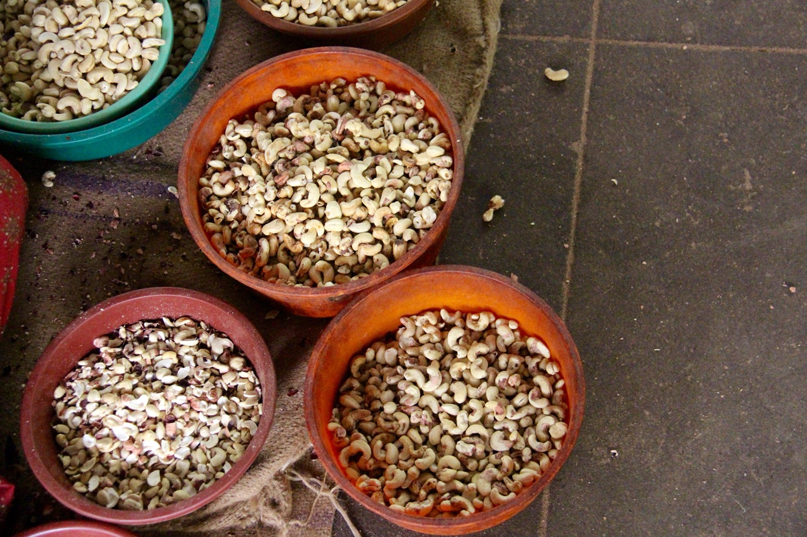 About an hour into the journey we stopped off at a cashew factory. Here cashews are processed from plant to final nut. Cashew trees grow all around here. The fruit is a bulbous red squidgy fruit (which tastes like a horrible, bitter sponge – I tried some in Nicaragua last year), and on top a green cashew shell.