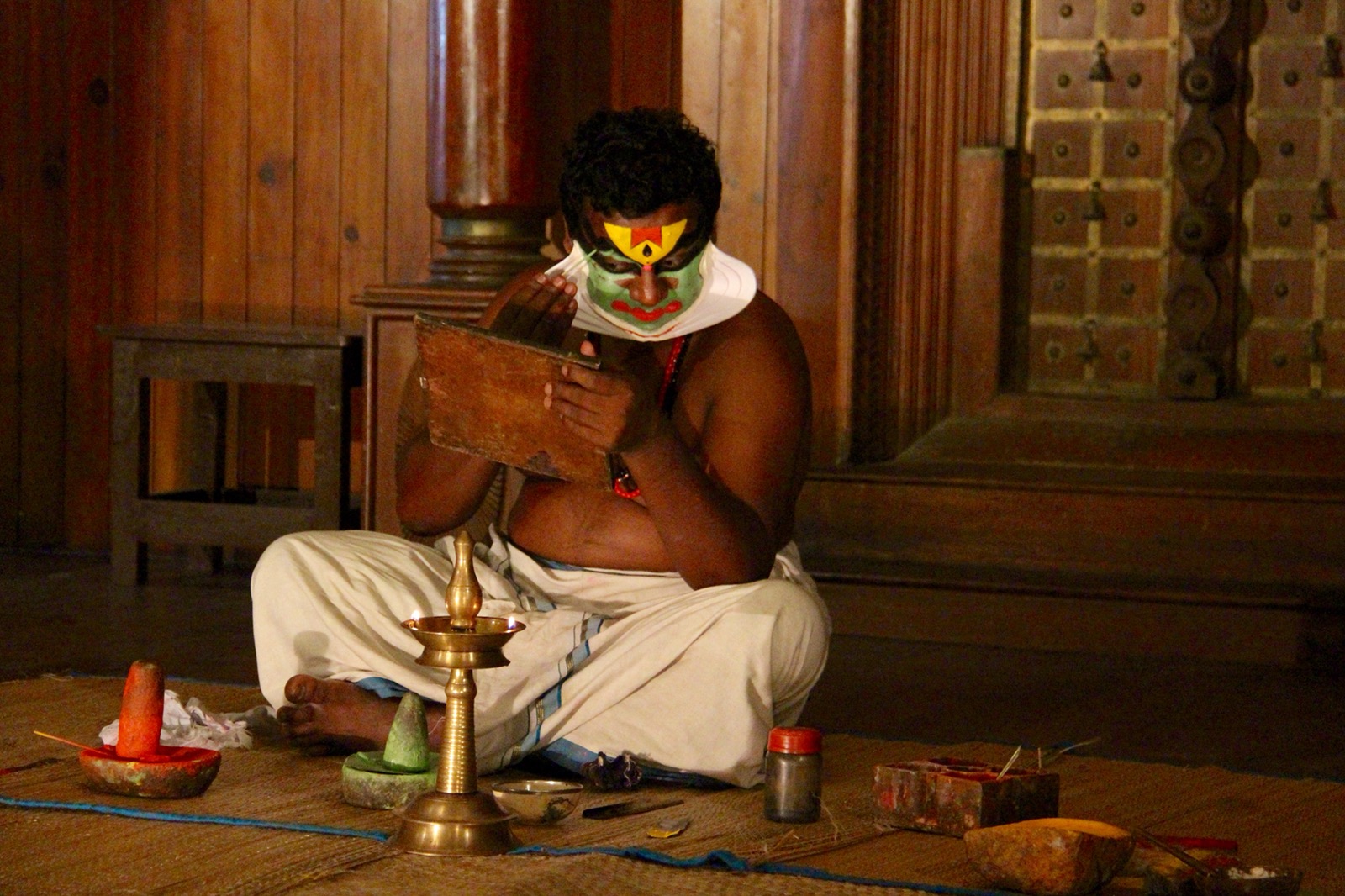 Kathakali is a performance with elaborate gestures and heavy mask-like makeup. The stories are those of the Ramayana. Traditionally performances start in temple grounds in the evening and go on all night. However the version we are watching is significantly shortened. The men were getting their make up done as we arrived – and you can watch as their faces are painted in bright colours. Each of the colours is made by rubbing a coloured rock with coconut oil. That took a while (45mins!).