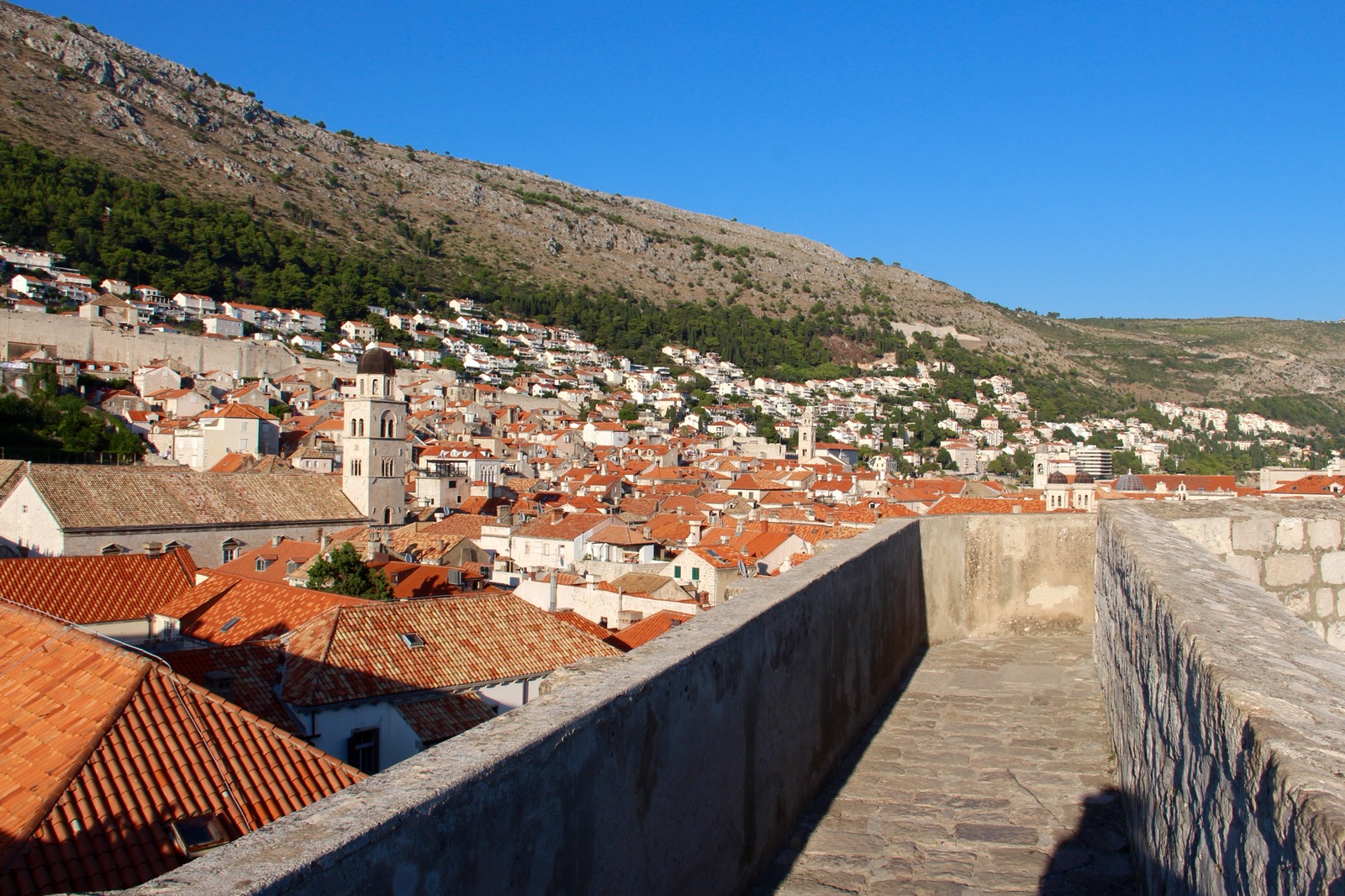 The old town of Dubrovnik is entirely surrounded by 2km long, 25m high stone walls. The walls were built between the 13th and 16th centuries to protect the old city. They were destroyed and rebuilt several times throughout various wars.