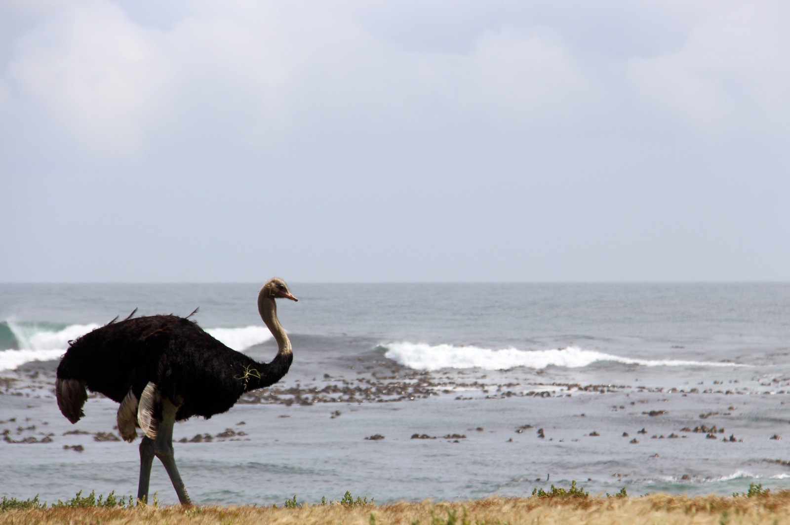 To get away from the crowds, we headed away from this beach, just a bit further up the coast, to our own deserted section. It’s not possible to swim in any of the waters around here. It’s cold. Wavy. And there are strong undercurrents. There was a wild ostrich wandering along the beach! Took care to stay well away – they are a bit scary!