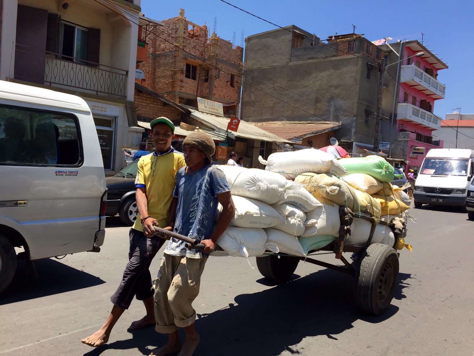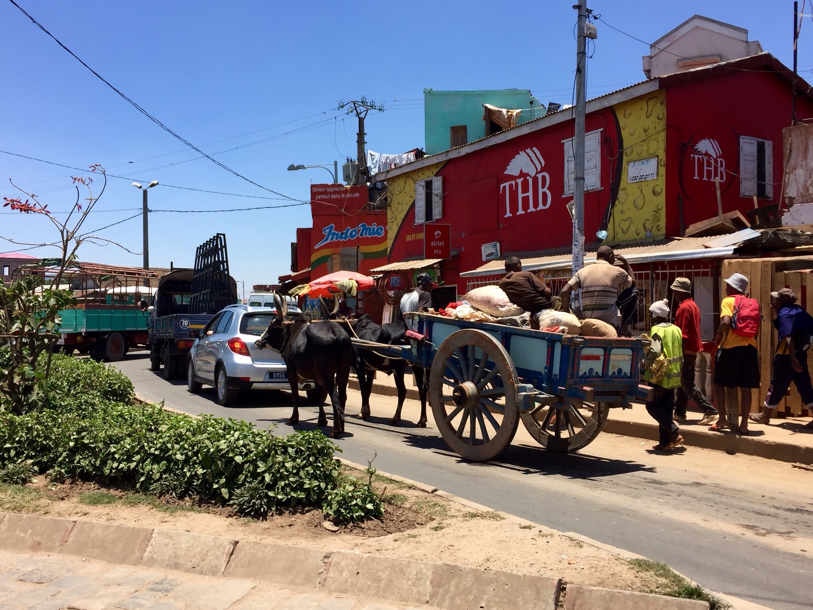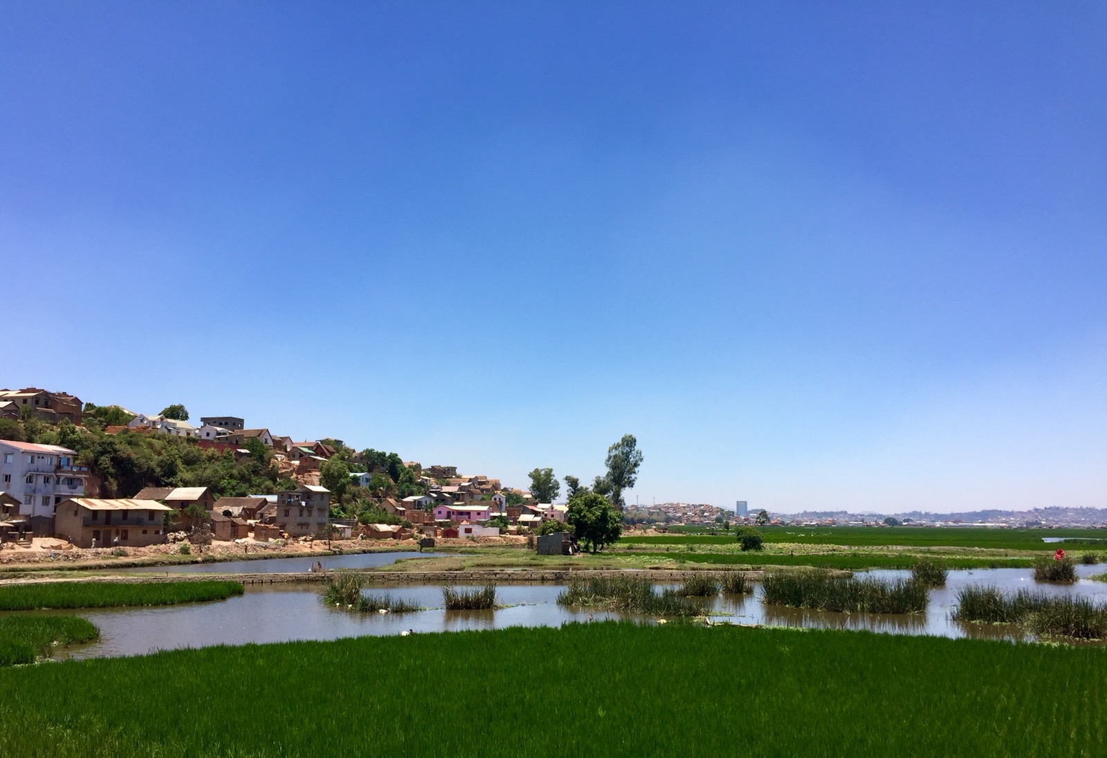 Some notes about the city: – it’s very spread out – traffic looked horrendous heading back to the airport. It was not moving for several miles. – despite being a city, it is mostly very rural looking – dusty – men pulling carts walk casually down the narrow road, as buses and cars swerve around them – children pushing other children on wooden trolleys move casually down the narrow road, as buses and cars swerve around them – there are rice paddies in the city – the rice paddies are surrounded by waterways – women wash clothes in these waterways and leave them on the banks (right by the road) to dry – there is a shop for everything – rice, vegetables, fruit, meat, phones, random plastic stuff… – people don’t look African. Some do. But most look a variety of Asian. – everywhere looks like Asia – shoes are optional – no 3G.