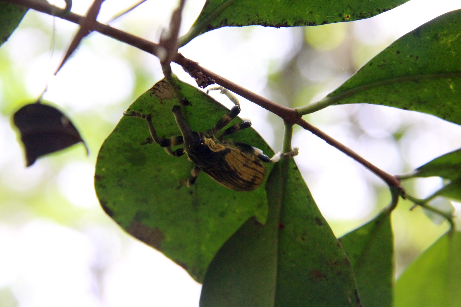 The guide found so many things everywhere, a small leaf tailed gekko curled up on a leaf – I like these! A caterpillar, various small frogs, a stick insect, a small bird nest. Plus some more cool things – an elephant beetle! This was odd looking, bright yellow and black, with strange shaped stick legs. And a giraffe beetle – like we saw in the previous park.