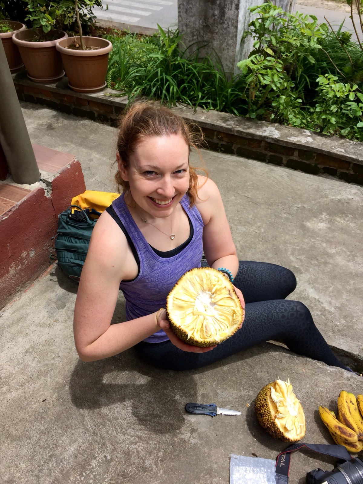 As we drove back to the hotel, we stopped off in the village just so that I could buy a jackfruit. (Given I haven’t shut up about them, since spotting them by the side of the road a few days ago). They had a whole pile of them! And one cost 40p!!! So cheap!! Back at the hotel, I enjoyed a jackfruit lunch! I felt like I ate loads of it, but only managed about a quarter!