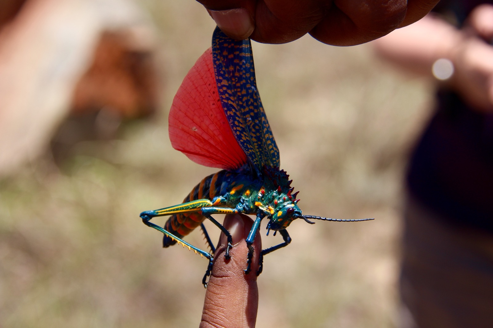 There were a few different small animals around too – stick insects, a couple of small poisonous frogs, sekada, grasshoppers and a really cool locust! The locus looked like it was made from plastic – it was green, with bright yellow and red dots all over it. The guide picked it up and opened its wings – they were bright red!
