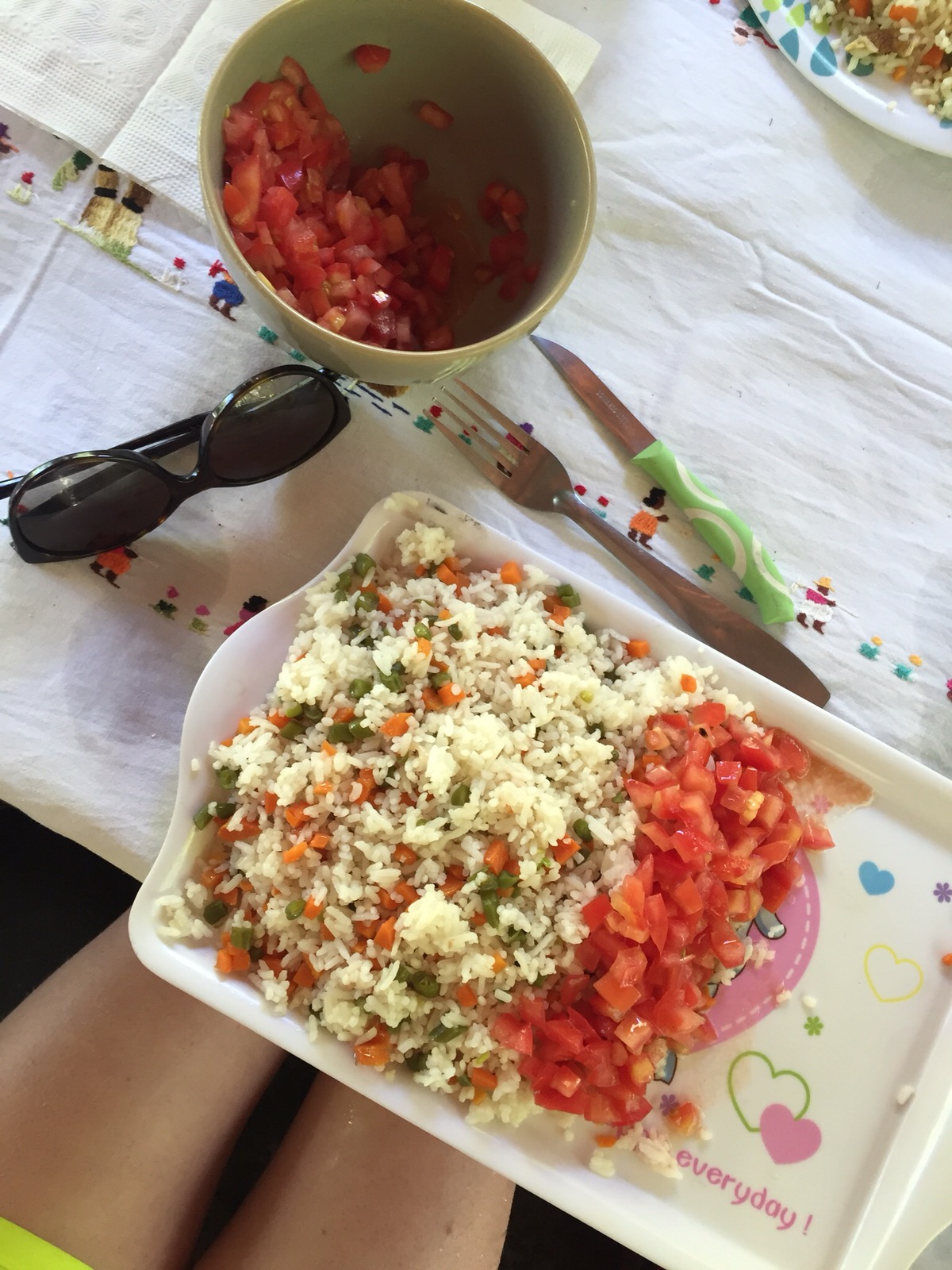 Just as we made it all the way down the stairs, we were onto a mud path. And a load of swaying, black and white tails were walking towards us! A whole family of ring tailed lemurs! They were so cute, all walking in a line! Once they got to us, they didn’t know what to do – so ran around us and jumped up into the trees. There were a few small babies holding onto the backs of the mothers too. We arrived at a campsite and the camp cooks had prepared lunch for us! Again, I had a special no onion, no egg, no meat meal. They had made rice (with bits of carrot and green beans) and tomatoes. It was so good!!! So plain, but tasted really good and made a change from the usual rubbish plain food I’ve eaten so far!