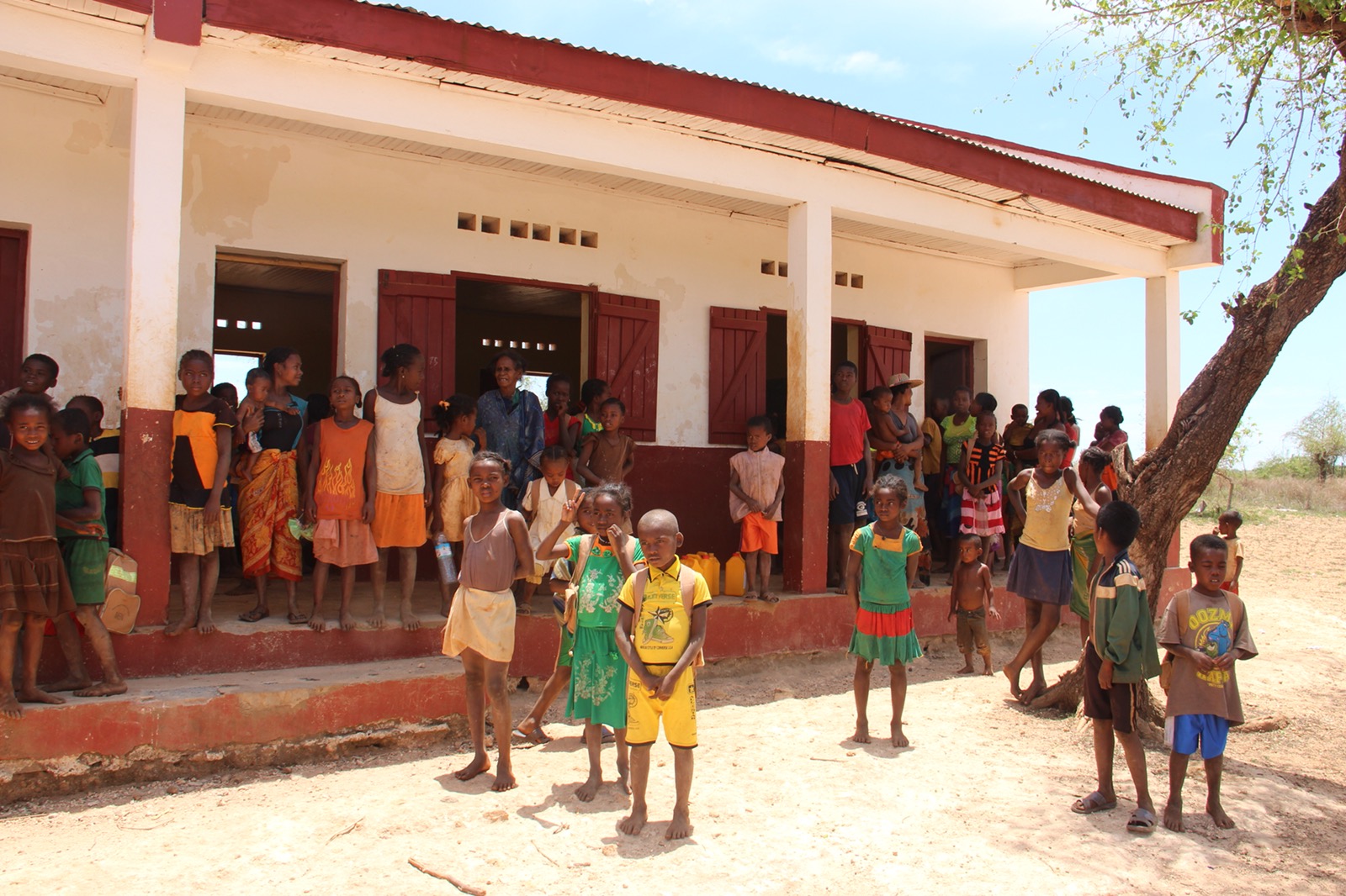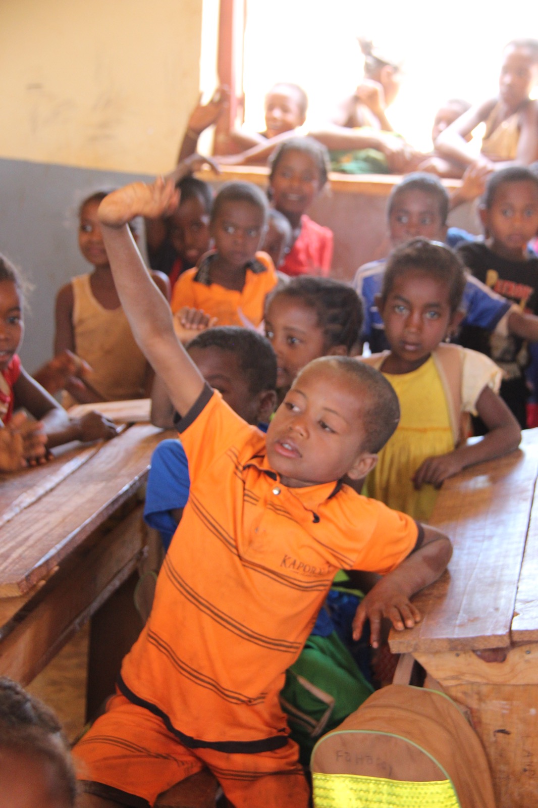 Earlier this morning we had all given a bit of money to the guide and he had gone to a shop and bought a mountain of exercise books, pens and pencils. We stopped off at a small village school to donate these. The school was in the middle of the countryside, a concrete building with two classrooms and a dining room made of branches and leaves. There are 60 children per class and 5 classes. Their classrooms were bare, 4 small children on each wooden bench-desk and a blackboard. Apparently most parents can’t afford to buy an exercise book for their child (they cost 500 ariary – 10p).