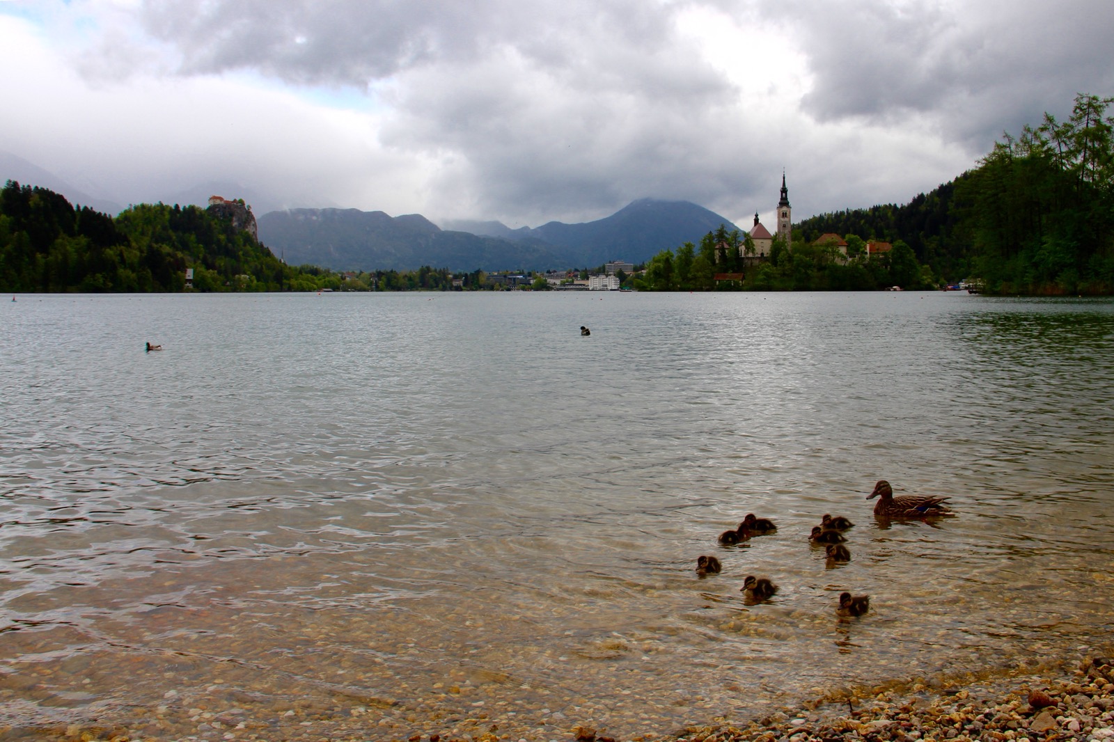 The lake is the main tourist spot of the country. And is relatively small, 2km long by 1.5km wide. We stopped for some photos at various points along the shoreline. Baby ducks swimming along the edge. And nice views of the water, with the little island (only island in Slovenia), green alpine forest trees and the snow covered mountains in the background.