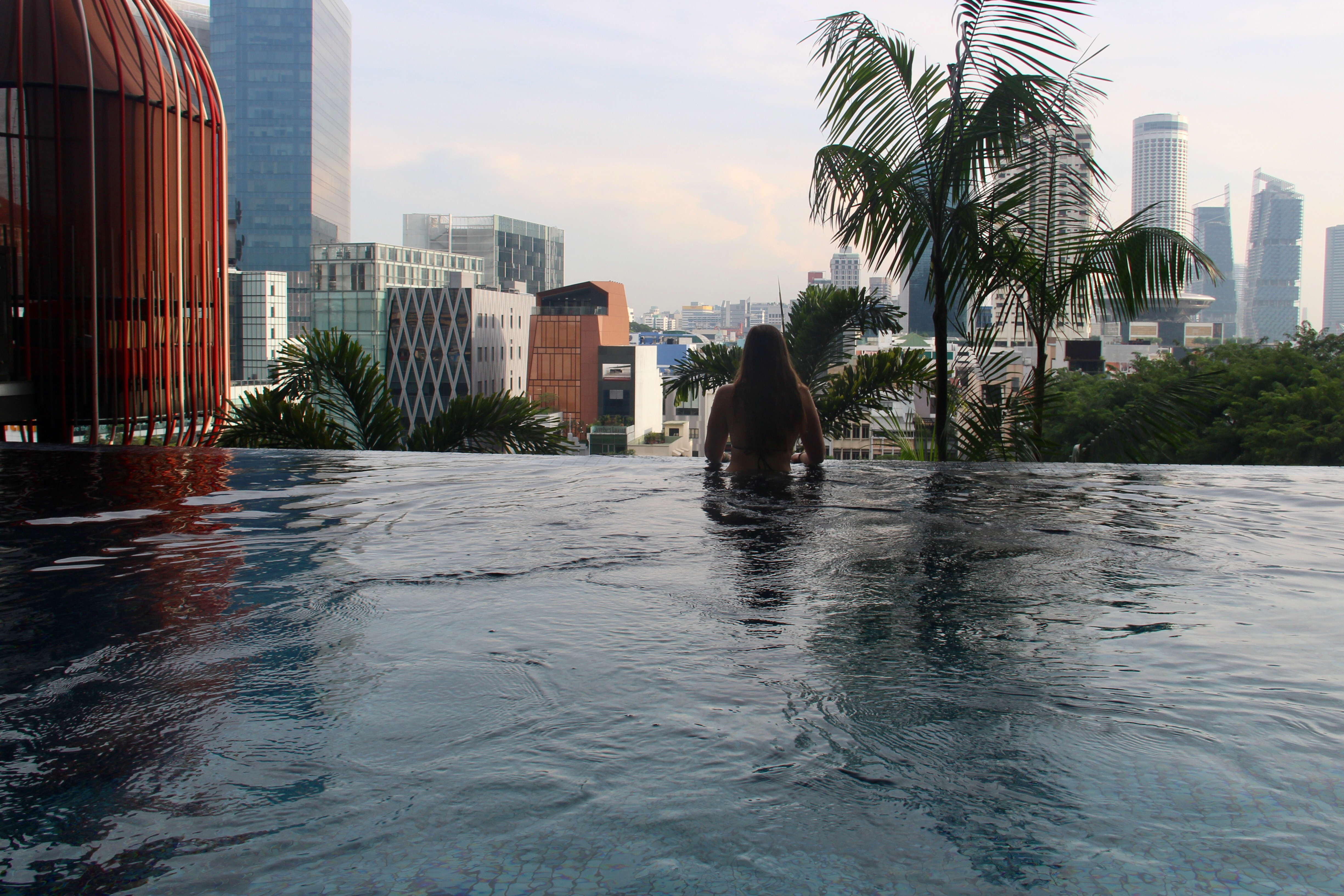 I was up early, so went to the pool to beat the crowds. The view from here was equally as amazing. The same direction as my room (my room being literally just above the pool). But with the skyline reflected in the infinity pool. Large bird cage style booths were dotted around to sit in. All so beautiful.