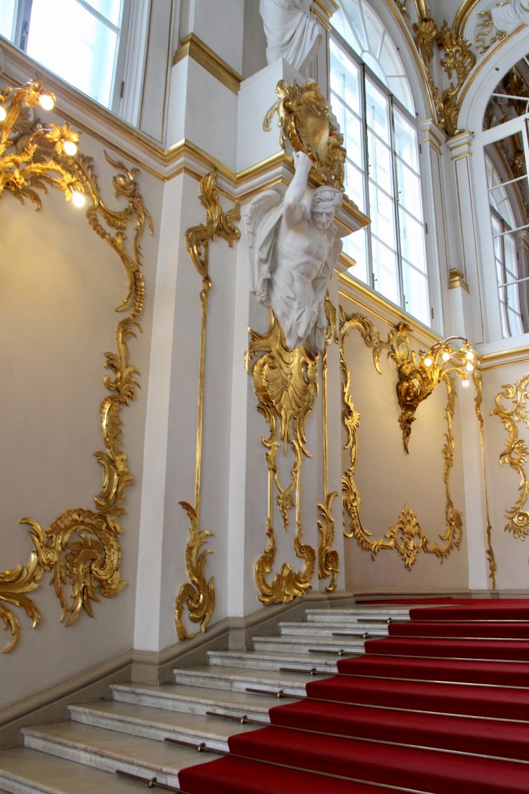 After coming to grips with the map of the enormous building, we navigated our way to the winter palace portion of the buildings. And the Jordan staircase. This is a large staircase, winding upwards and built in the 18th century out of white marble. This was the entranceway to palace for official visitors. We had arrived just as several tour groups had arrived. It was chaotic. All pushing up the red carpet, to the upper level. In a room full of gold.