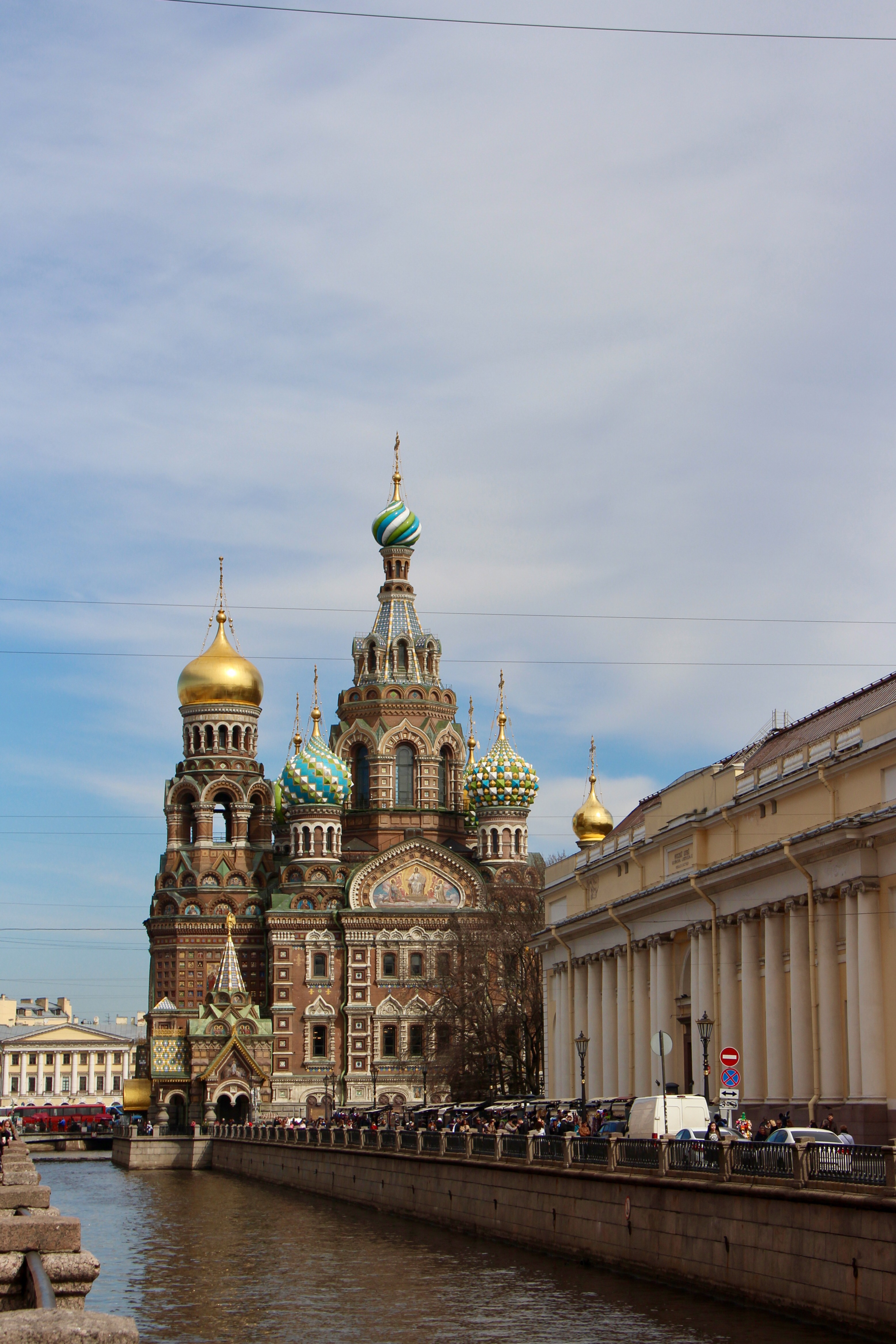 We left at 9.30am for a walk around. Today it’s sunny. But still cold. We headed down past the Gostiny Dvor metro station – basically a huge old department store. It went on forever – yellow arches covering the pavement. Then along a few different canals for a bit, over some pretty bridges, past rows and rows of old blocks of buildings, and we reached a cathedral.