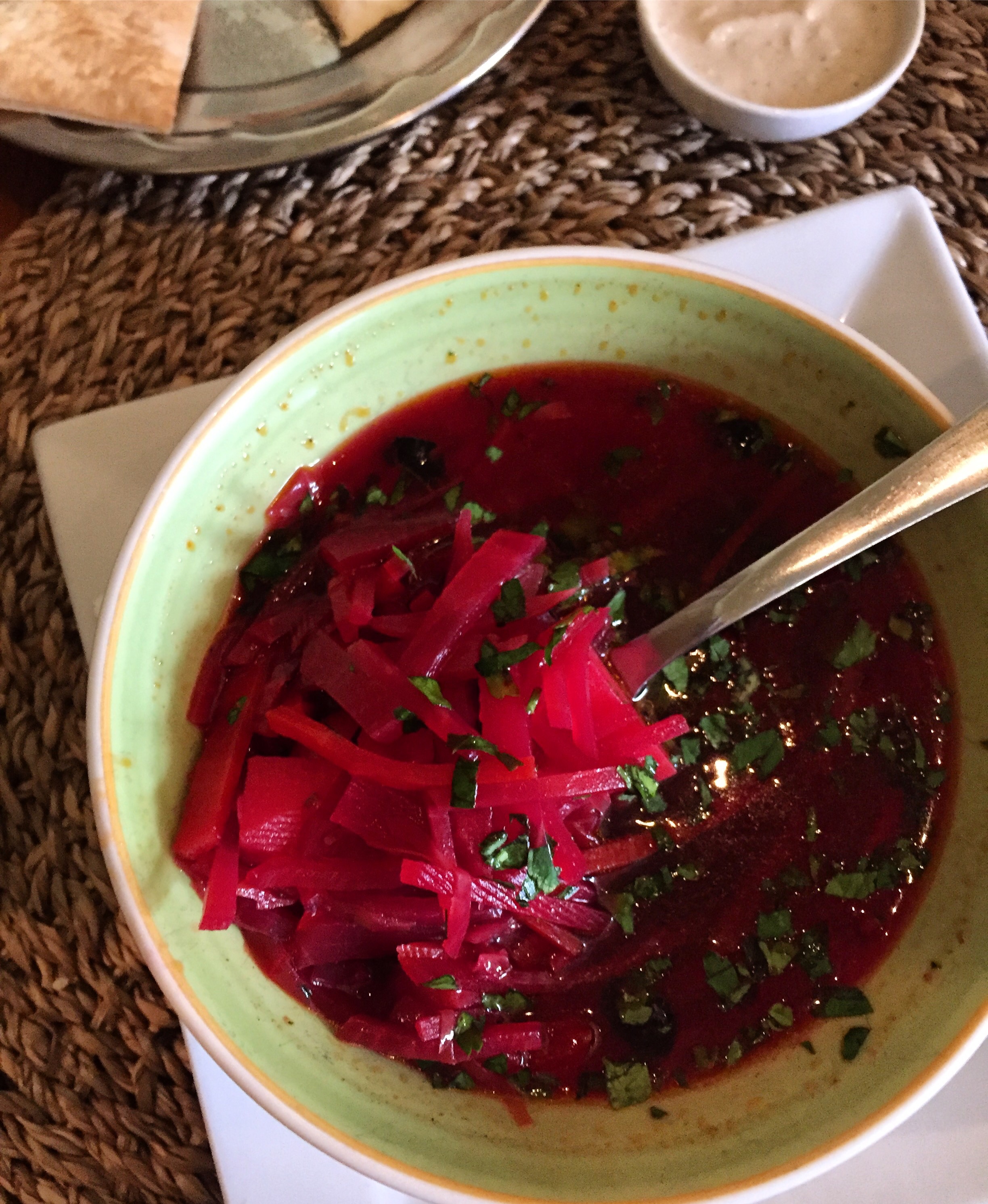 It was very old fashioned inside, but cute. And a very full menu. I had to force myself not to order my standard; falafel or curry. And I ordered a Russian soup – Borscht. It was a red liquid, full of beetroot, carrot, potato and kidney beans. It was so tasty. We also ordered some banana bread with a cashew cream. It came in a small ceramic pot, random. But was really delicious.