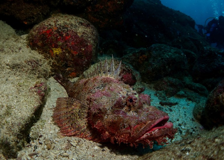 Here the dive is a bit different. Negative entry means negative entry. The style of diving can only be described as rock climbing. You sink as fast as possible (i.e. wearing too many weights) to the rocky bottom at around 12m. Then literally pull yourself – with your arms – along the rocks in roaring current until you reach an edge at 18m. Here it drops off to 24m, which is is possible to drop down to. But largely you spend your time holding onto the sharp barnacle covered rocks for dear life. Sometimes with your whole body. Good buoyancy is a thing of the past.
