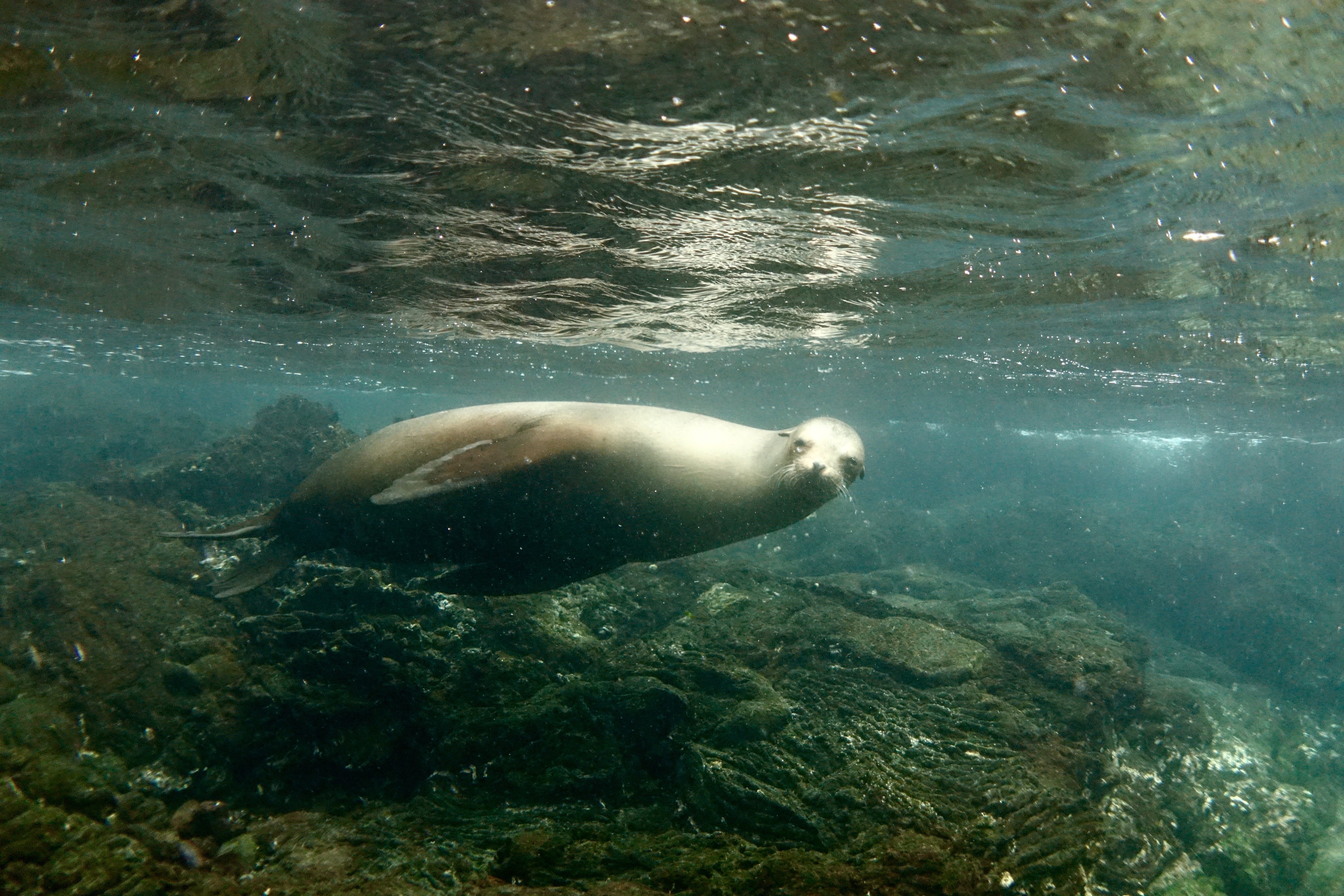 A white sand beach, surrounded by volcanic lava flow rock. I went snorkelling along the edge of the rocks. Standard things – blennies, parrot fish, small snapper, nothing that exciting. (I’ve been very spoilt the past week). But there were a couple of sea lions swimming around in the water next to me, which was cool.