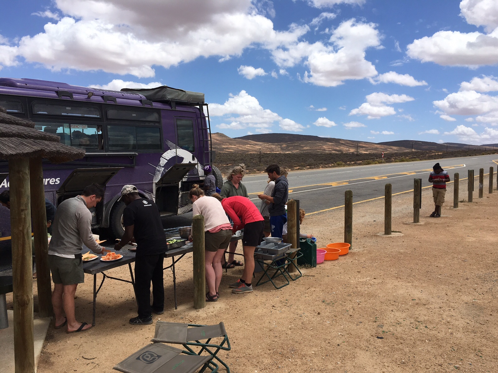 Lunch was again at the side of the road. It was windy. I was kitchen group, so chopping salad. Rolls of tomato, lettuce, avo and cucumber. I have been eating sweet chilli sauce with everything so far – but today they had a new apricot chutney. Exciting small things!