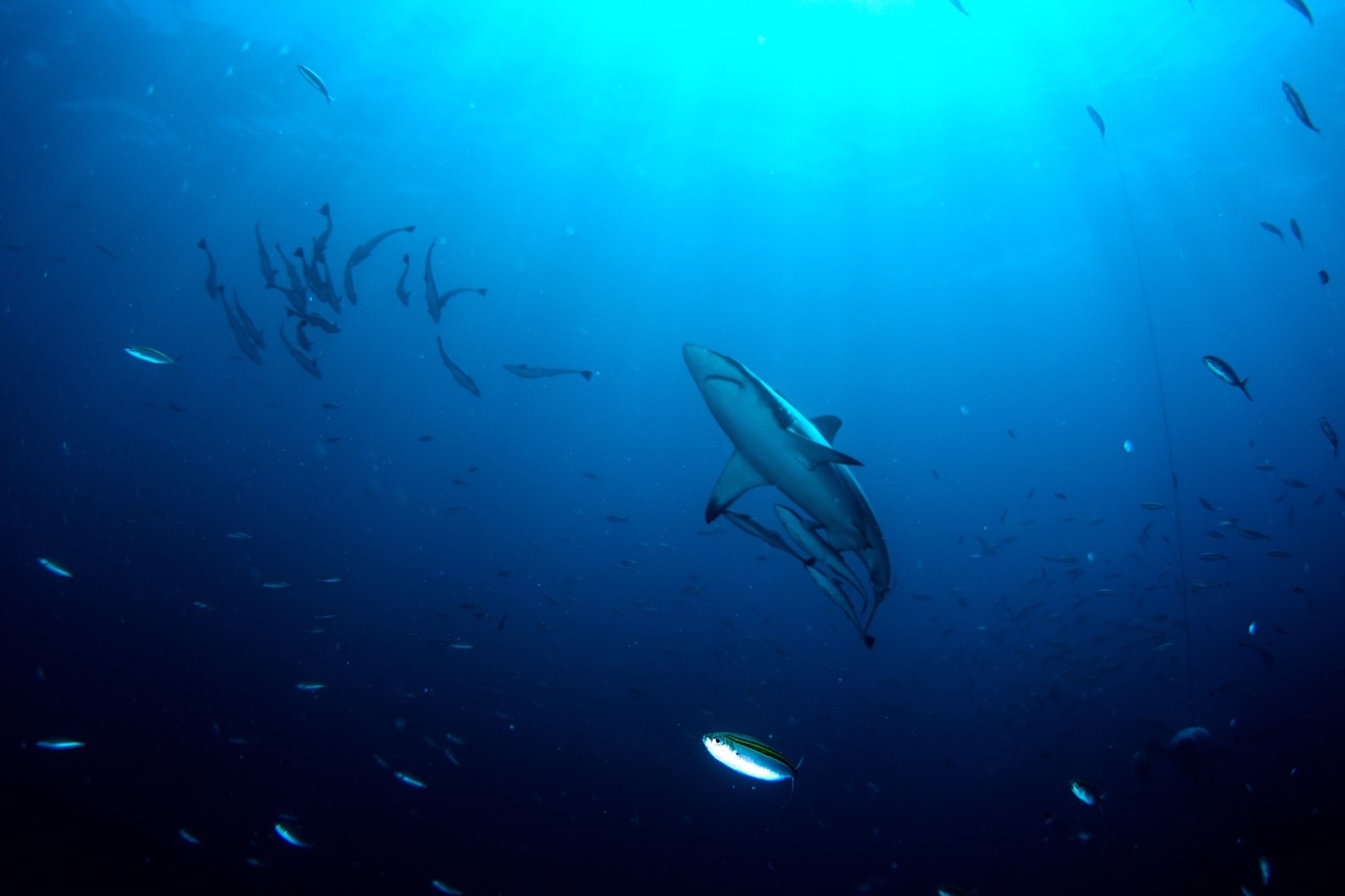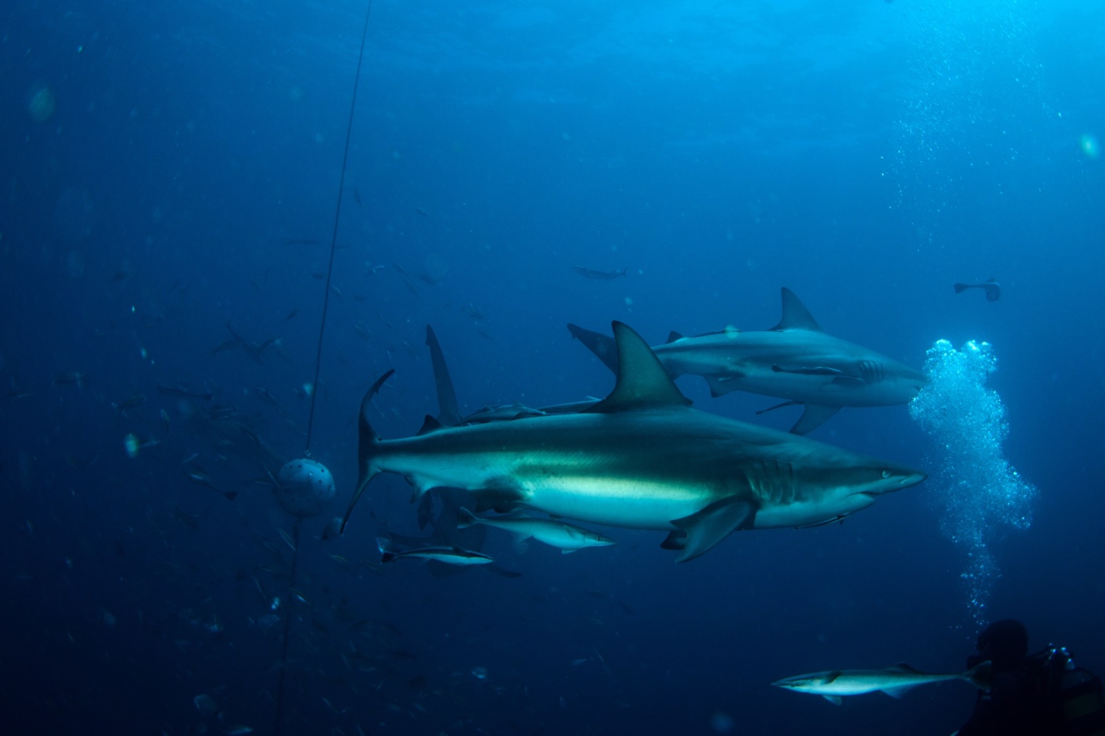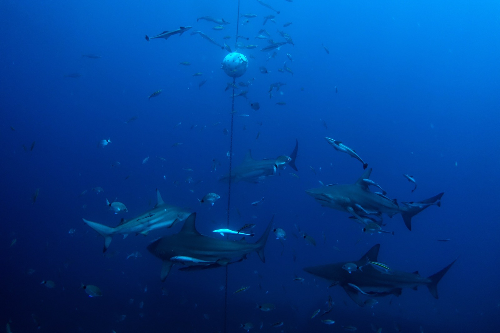 Even when they were setting the bait balls into the water, the oceanic black tips were splashing around on the surface. So many of them.