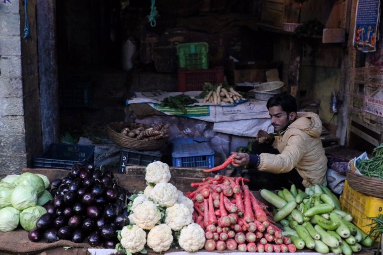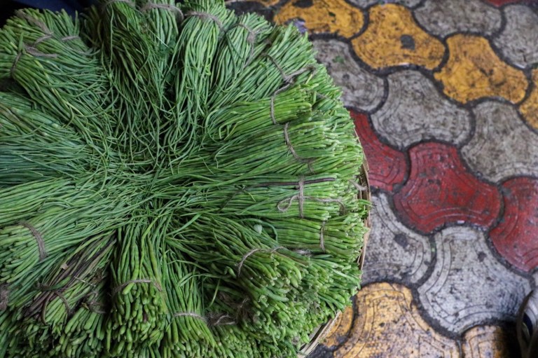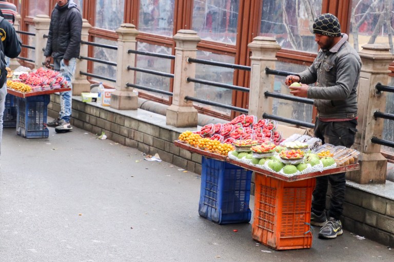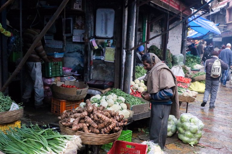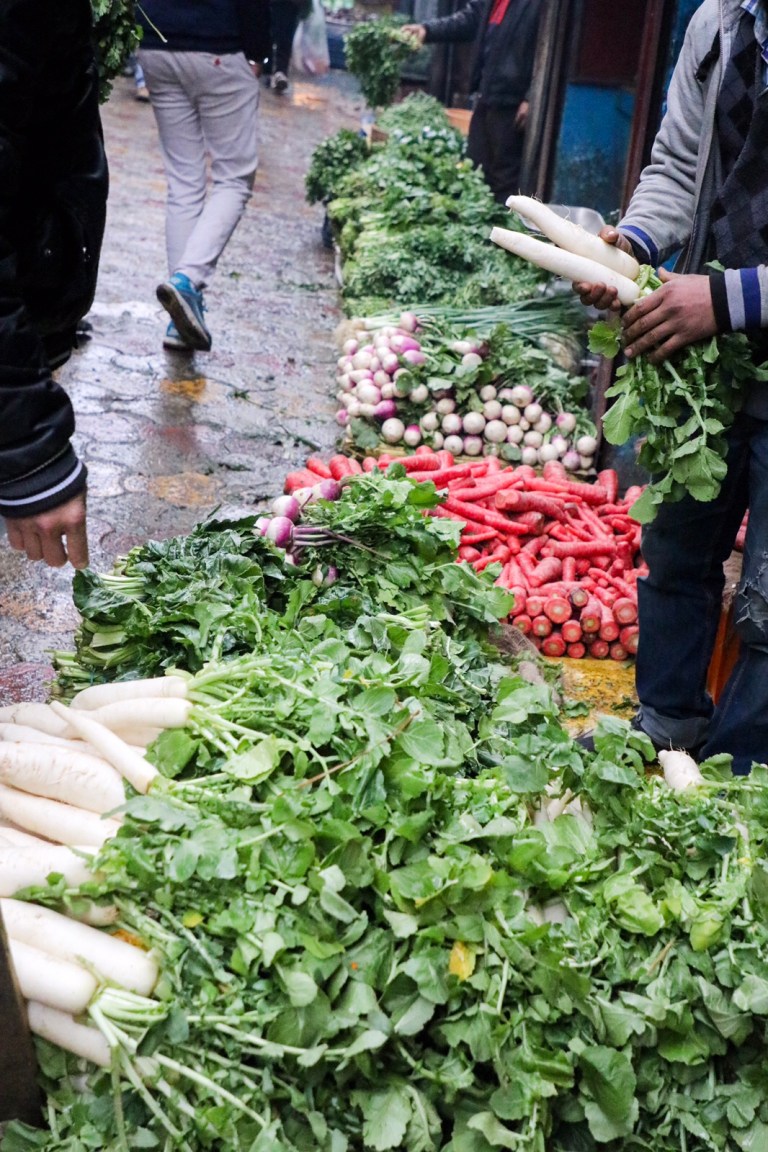 The lanes split in different directions, one headed down was a fruit and vegetable market. Colours spilling out on the street in all directions. A lot of noise – every stall owner shouting out their goods. And people moving all around. It was hectic. And smokey – many people had small fires lit, I guess to keep warm.
