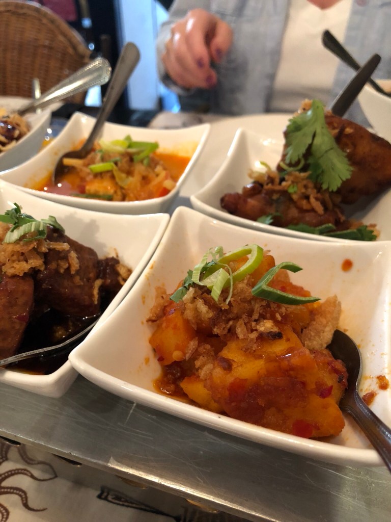 Obviously we got vegetarian – which was entirely vegan except for one dish (which I didn’t eat). We had sate tempeh, spicy tempeh, curried green beans, corn cakes, spicy potato, gado-gado (vegetables in peanut sauce). And fried bananas for dessert! It was all good.