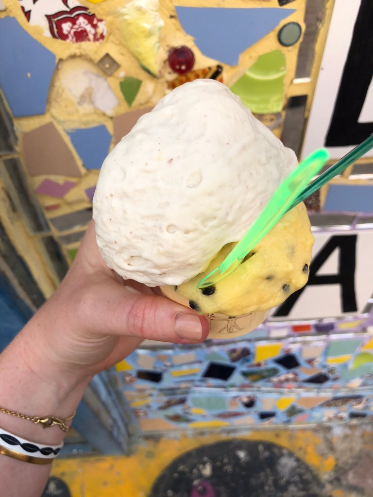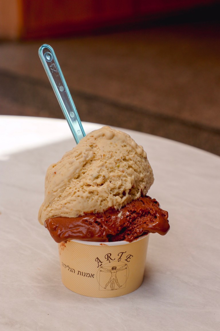 Carmel market is closed today (will go on Monday). But a couple of shops were open. Including Arte glideria – the gelato shop with 15 (!) vegan flavours!! After being given many samples, we got almond flavour and passion fruit flavour. So good!