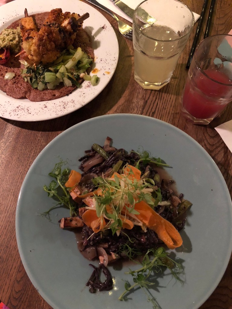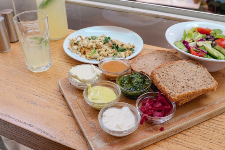 It was some slices of bread, with a salad, scrambled tofu (which had black salt in, so tasted weirdly like egg) and a lot of dips – turmeric tahini, soy cottage cheese, sauerkraut, pesto and hazelnut butter. It was good.