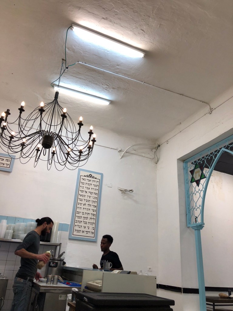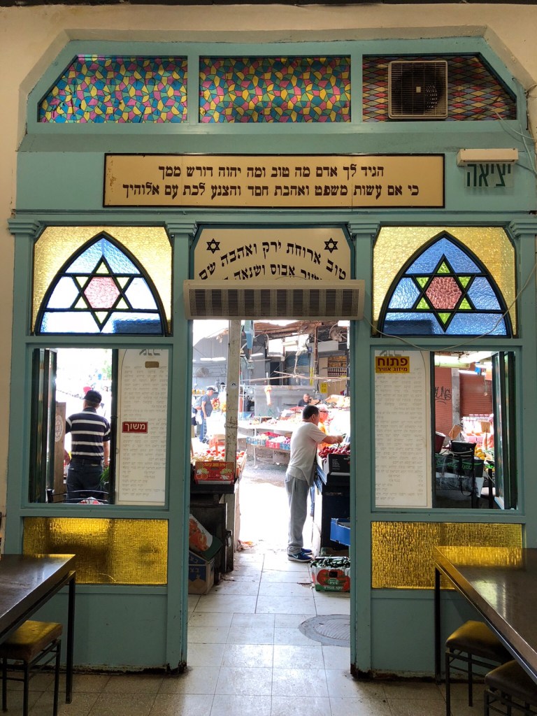 We wandered down the whole length of the market. Then stopped off at a hummus shop – Humus HaCarmel. This cafe is inside an old synagogue and has retained some of the features – stained glass windows and writing across the walls. It was cool.