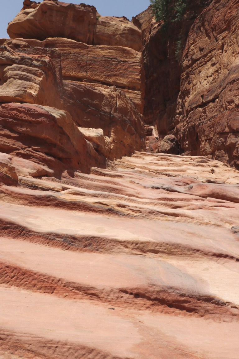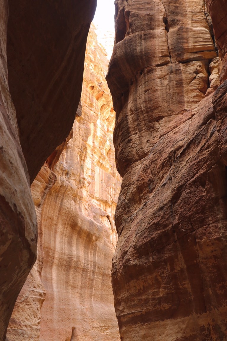 The entrance is a 1.2km long crack through the rock – called the Siq. In certain places you can see matching stone strata on both sides – where an earthquake caused the rock to crack apart, forming the channel.