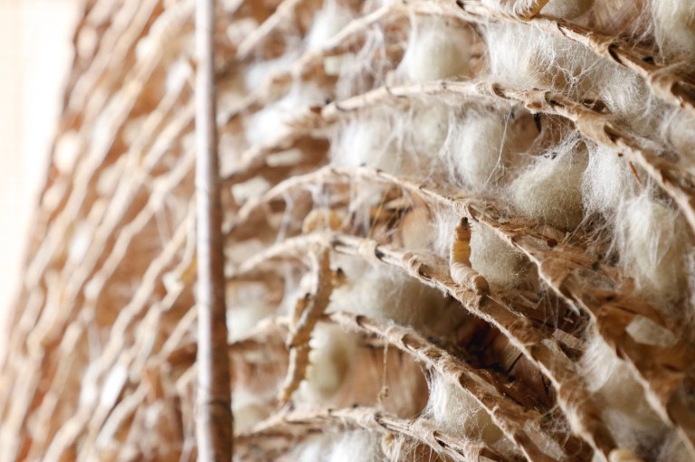 We stopped off at a silk farm – where they grow the silk worms and feed them mulberry leaves, until they form cocoons across large coconut leaf frames.