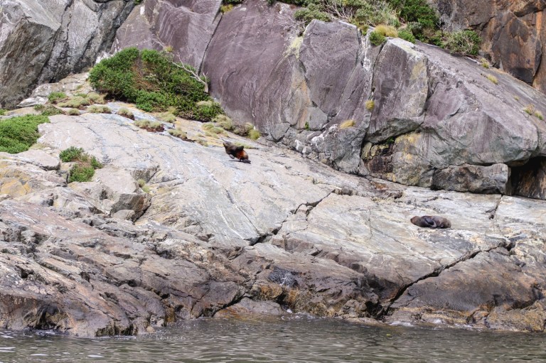We stopped off to look at some animals – fur seals lazing on some rocks, and a couple of small penguins waddling amongst some bushes.