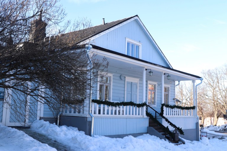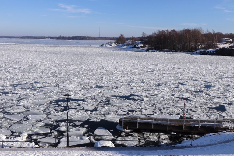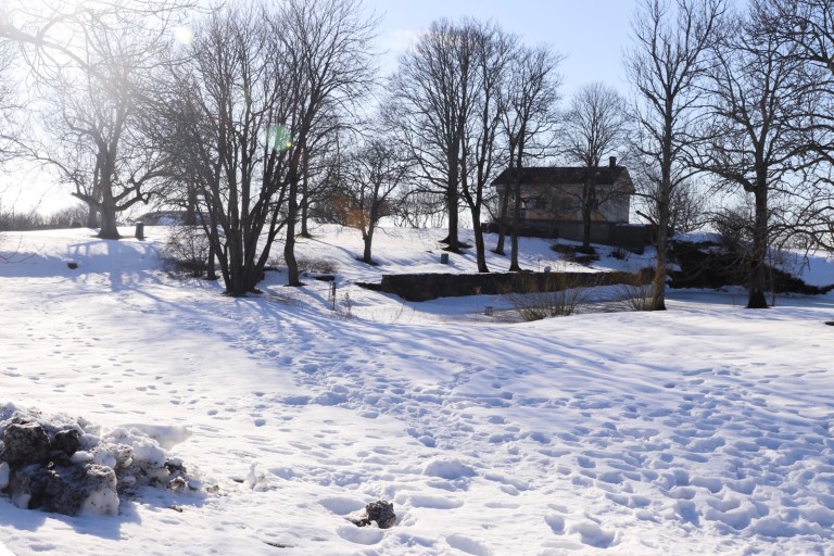 The island was also frozen. Snow and ice covering every surface. Cute houses, buried in white snow.