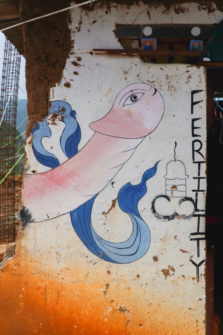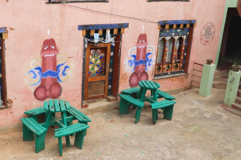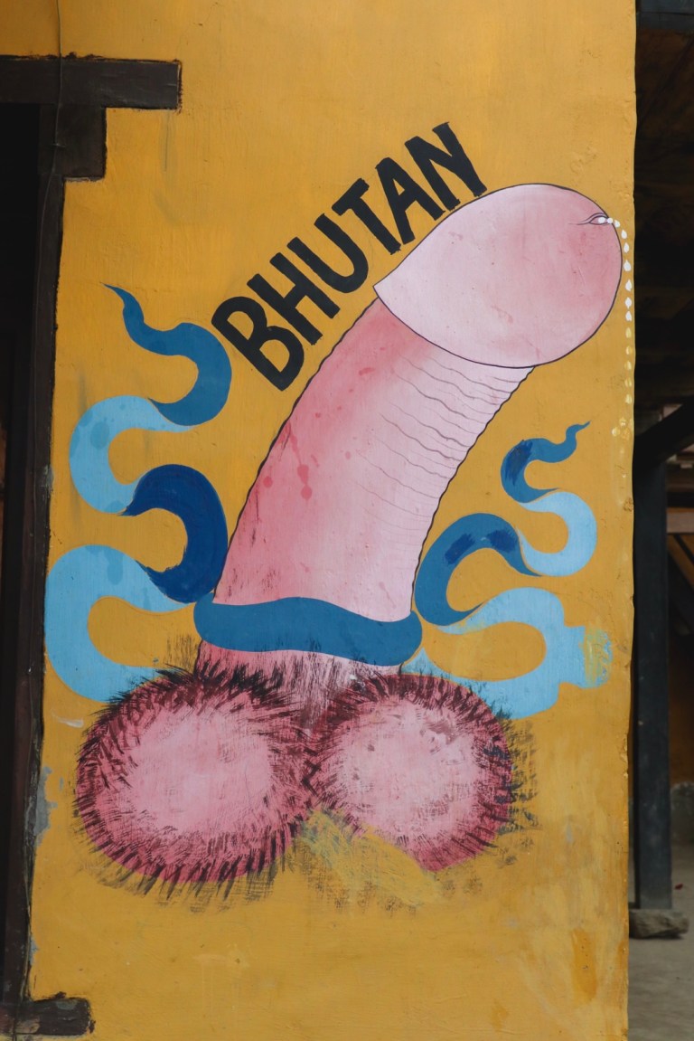 This village (Pana) takes one tradition to the extreme. Lama Drukpa Kunley (1455–1529) is one of Bhutan’s favourite saints. On one occasion when he received a blessing thread to hang around his neck, he wound it around his penis instead. Now, many houses have these painted on them. Often either side of the door. Sometimes, just in a random place.