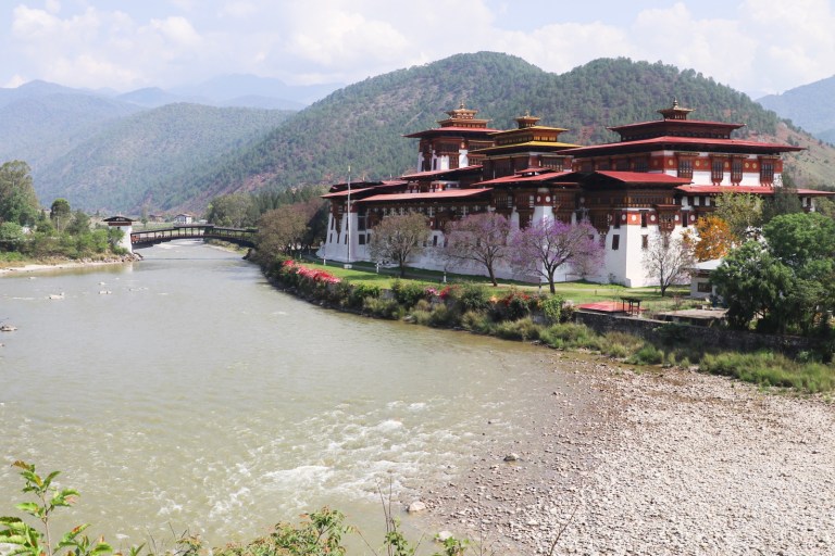 We passed by the Punakha Dzong. It was a beautiful building. Set on the river bank, surrounded by jacaranda trees with their lilac flowers and a red bridge connecting the building to the road. We couldn’t visit just yet, as the day time is reserved for monks to learn.