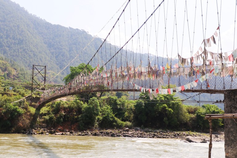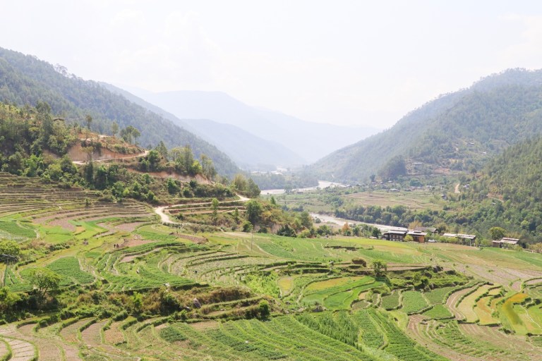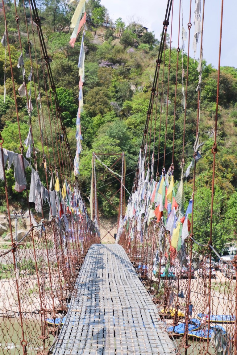 Instead, we carried along the valley, upstream. We got out for a walk across a prayer-flag covered suspension bridge, then through the rice fields and up part of the mountain to a monastery – Khamsum Yueley Chorten.