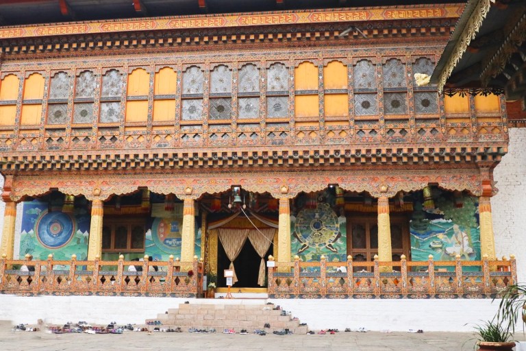 To cross into the Dzong, you go over a wooden bridge. Then up a steep set of stairs. There were various decorative courtyards before you reached the main “hundred-pillar” assembly hall (which has 54 pillars).