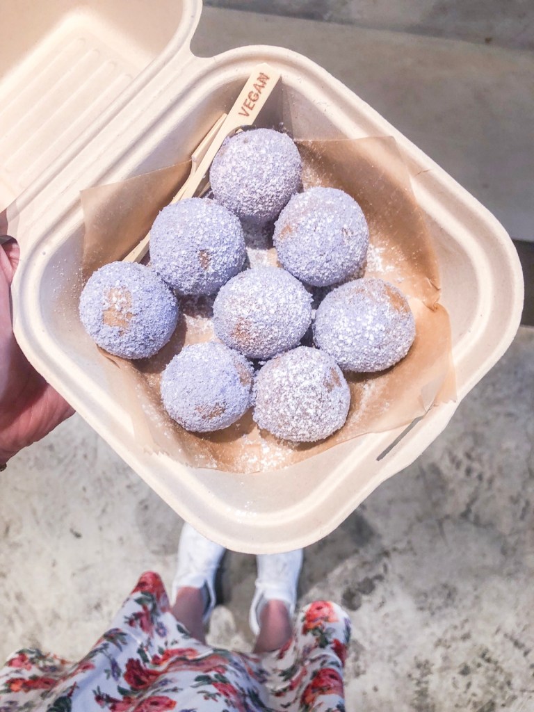 For dessert, a few doors down, at Alimama tea we got taro munchkins. These are small mocha donuts that I have never heard of before Mochi on the inside, covered in a crispy donut shell. And so delicious!