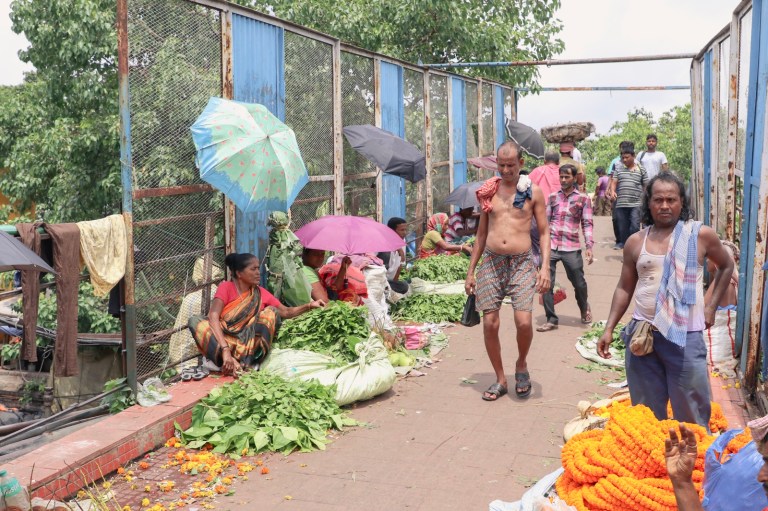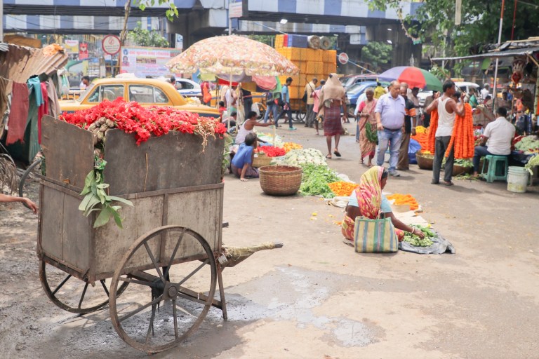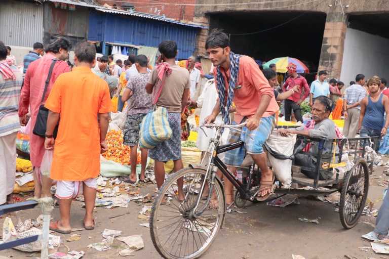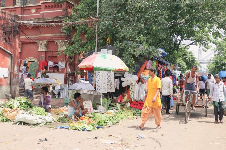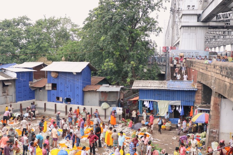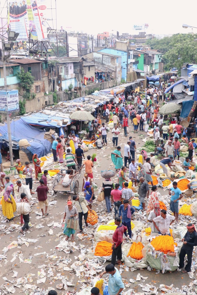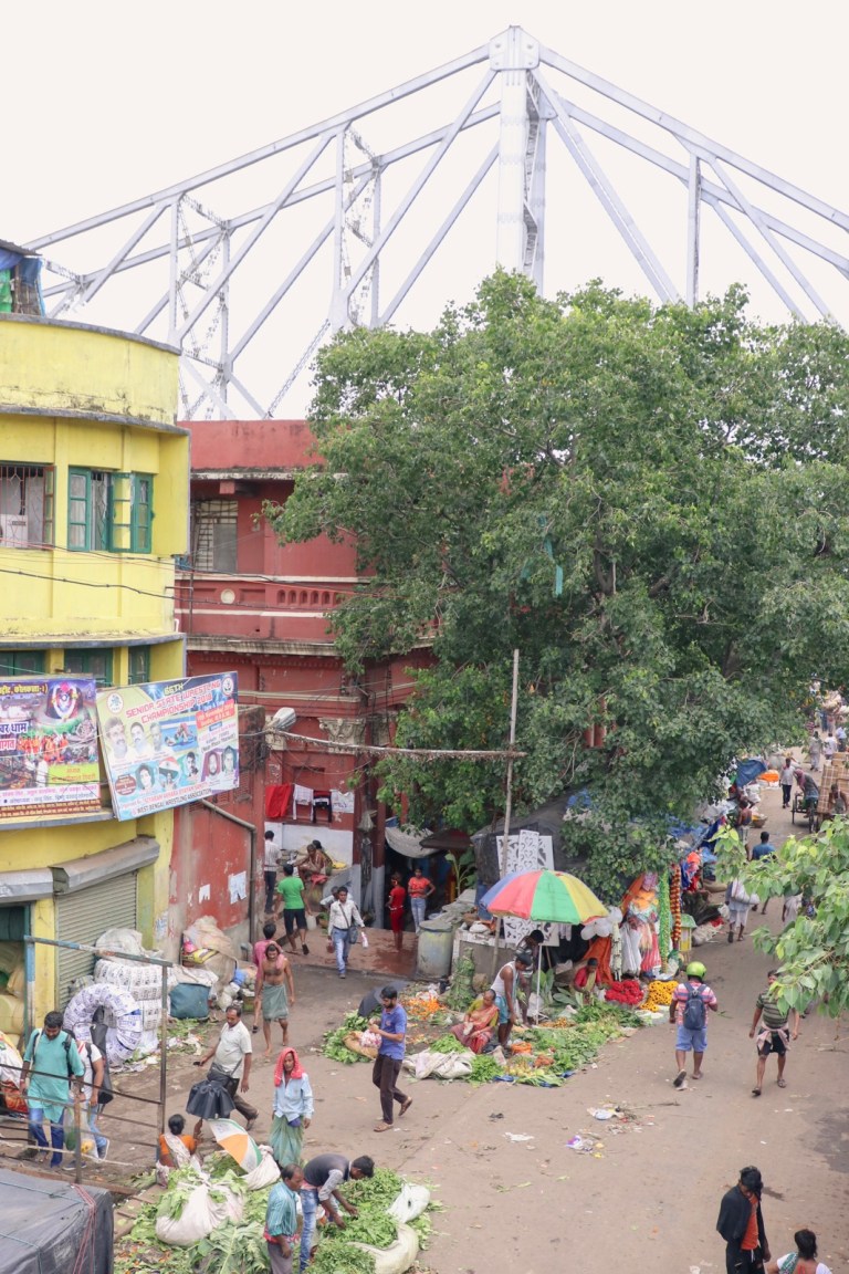 The flower market sits beneath the Howrah Bridge. This bridge is 705m-long and was built during WWII. It is one of the world’s busiest bridges – streams of buses, tuk tuks, bikes and taxis zooming by. And the pedestrian walkway completely solid with people moving across.