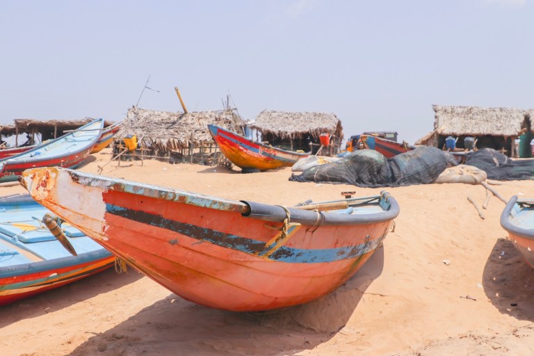 We stopped at a fishing village in Konark. The fishermen are not allowed to go out – there’s been a ban for the past few weeks due to bad weather. And the sea was pretty wavy. So the beach was lined with boats.