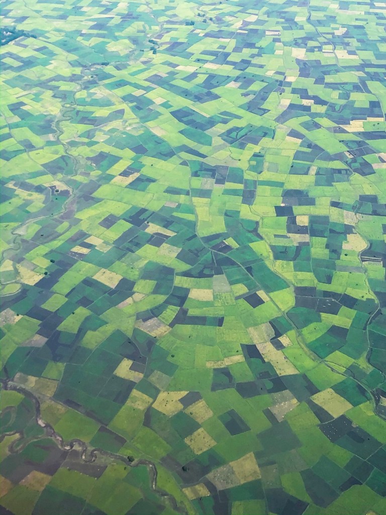 Here, the landscape changed. No longer dry. Instead very green and filled with green patches of crops.