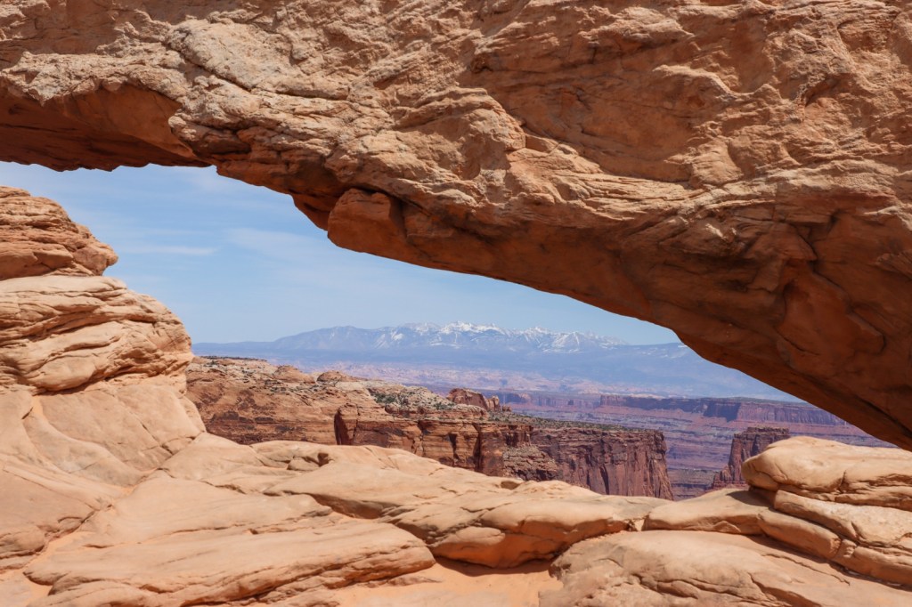 An amazing view, through the arch, to the surrounding snow-topped mountains, and swirling rocks.