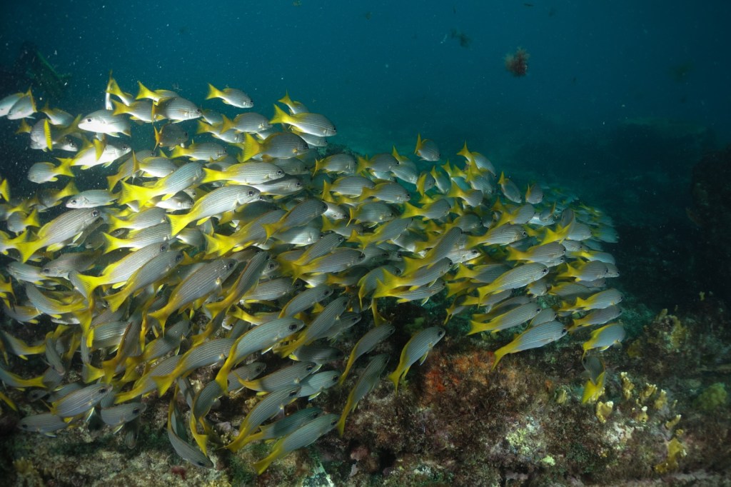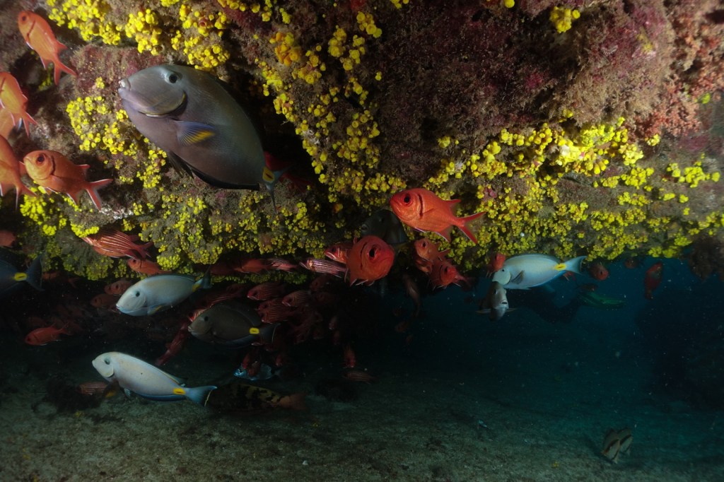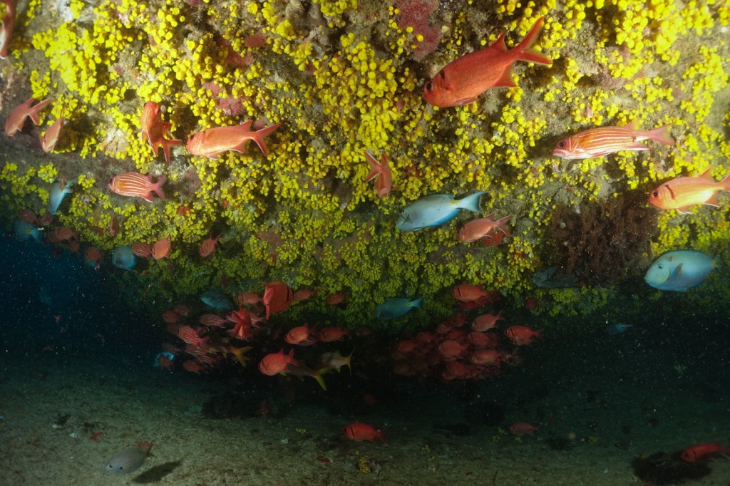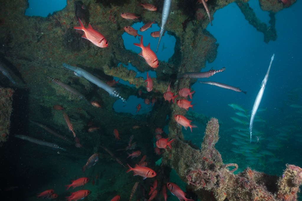 The islands are heavily over-fished. So there were no bigger fish or sharks. But there were a surprising amount of smaller schools, hiding in wrecks and caves